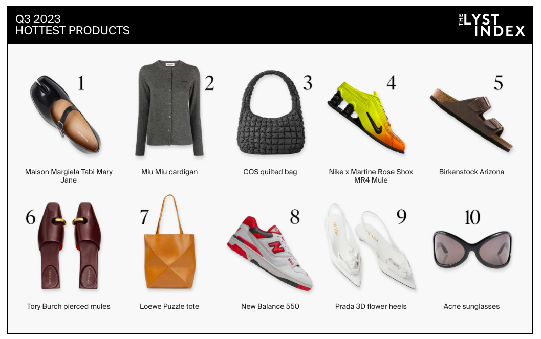 Perhaps ironically, the products leading the fashion charge aren’t exactly groundbreaking. Searches for cashmere cardigans shot up 12% after Miu Miu’s March 2023 show. The Miu Miu cardi, according to Lyst, was the second hottest product this quarter. The popularity of ballet flat rose 75% between March and September this year.