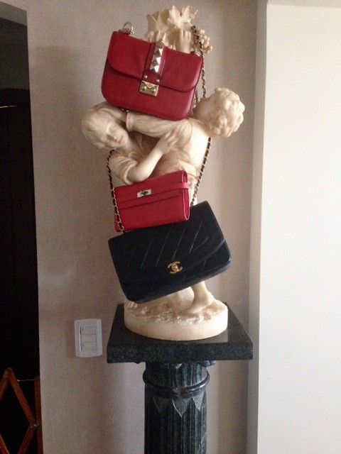 as promised, here are my fave 3 bags, StyledGuy ;) Red Valentino small Glam Lock bag, Bougainvillea Chèvre Hermès Kelly Wallet and vintage Chanel flap bag…and I hope my mom doesn´t see this pic or she´ll kill me for hanging my bags on her beloved marble statue hahahaha