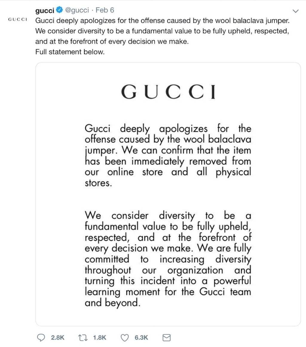 Gucci is the latest luxury house to step in it over allegedly insensitive racial actions. In this case, the offending item is an $800 knit balaclava that resembles “blackface.” The company has apologized and pulled the item. We’re wondering whether there will be a lingering effect in your shopping.