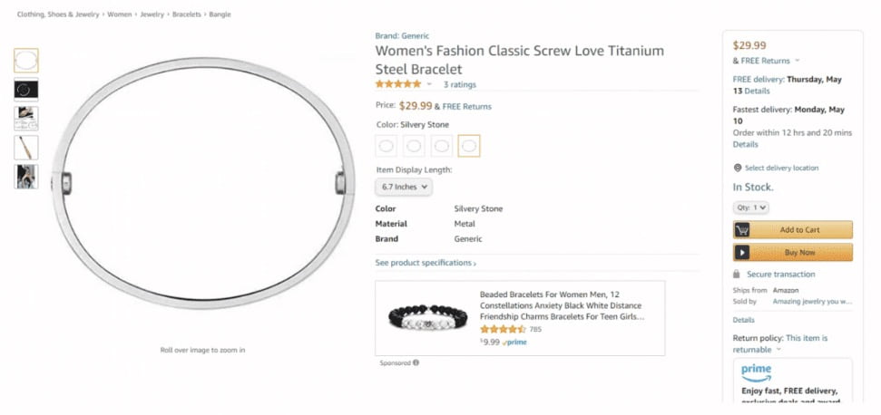 In this scenario, Amazon and Cartier focus their efforts on sellers posting generic, and often cleverly positioned images of what appear to be Cartier Love Bracelets. Moreover, the iconic Love Bracelet name is not used, but rather a simple description of “women’s bangle” or “screw bracelet.” Court documents detail that this practise occurred during the period from June 2020 to June 2021, as it applies to this specific group of sellers against whom the suit is levied. Additionally, it is alleged that the individuals behind the online vendors also marketed their products to followers on social media, detailing the process on what store to search for, what link to click, what product to select, etc.