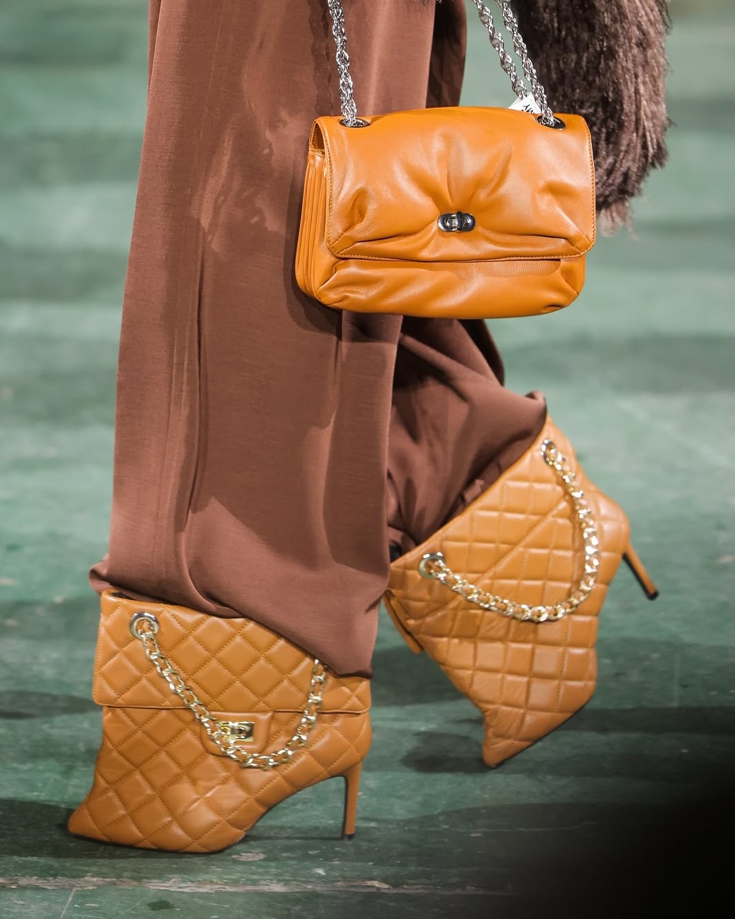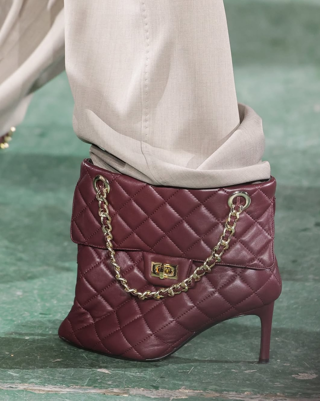 Think, “Is it a shoe, or is it a bag?” These ankle boots sport an all-over quilted leather design, a flap front, chain straps, and even turn-lock fastenings. Sound familiar? They were showcased in rich tan leather, a deep burgundy, black, and forest green, each accented with gold-tone hardware.