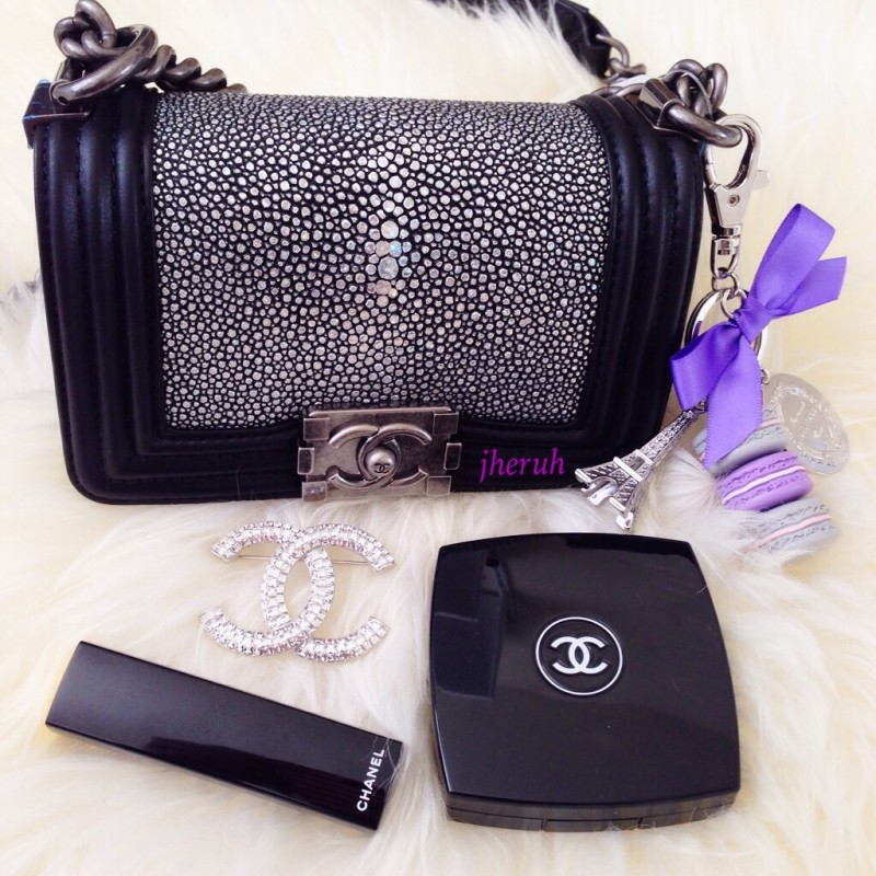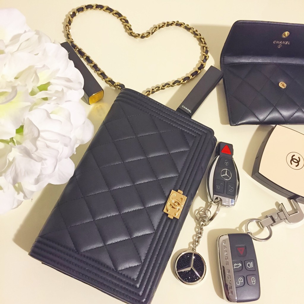 Today’s essentials. I don’t carry much when I go out for lunch and shopping with my friends. I love to wear crossbody bag like my Chanel stingray mini boy bag when shopping. Its handfree so its easier to shop. I just have my lipstick, pressed powder and a brooch, all from Chanel.
