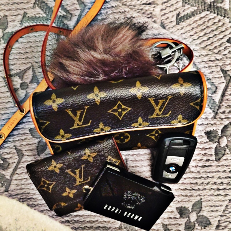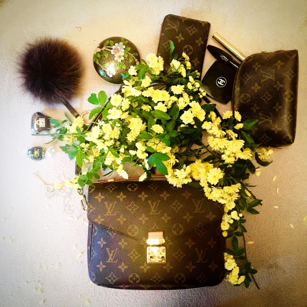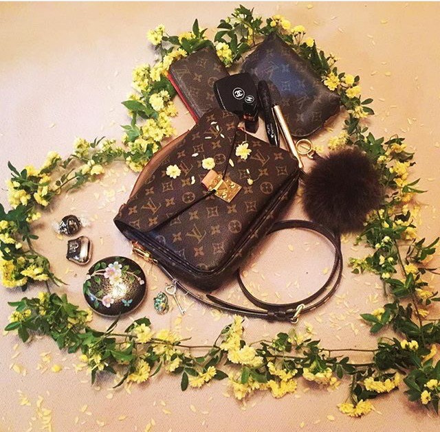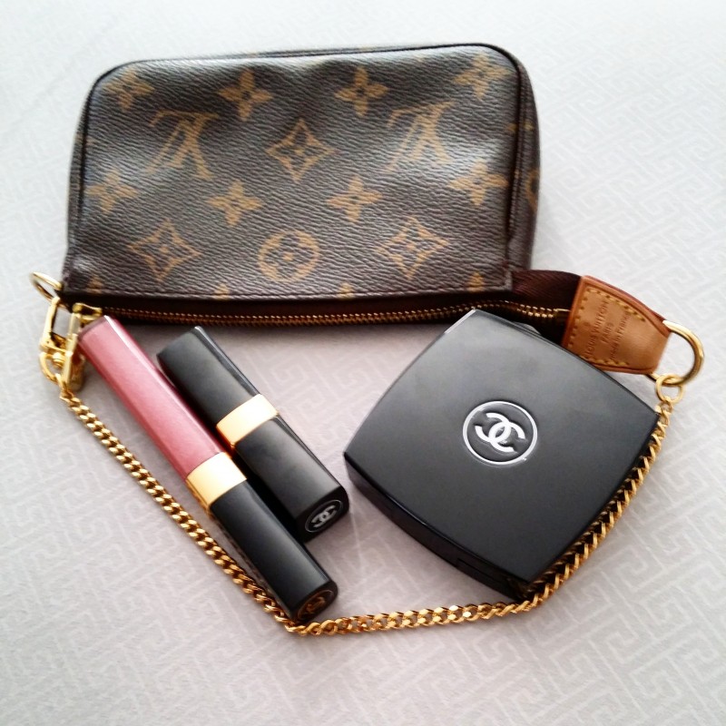 My Louis Vuitton Mini Pochette with her lovely Chanel girlfriends (lip gloss, lipstick, pressed powder). @bagsbabybody