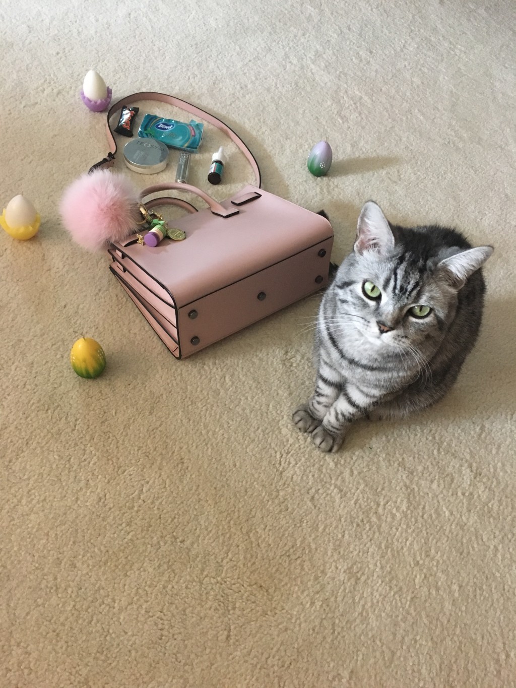 Sunday’s details. I only carry the essentials while out with my 2 kids ?. My boy thought my @fendi pompom looked like the Easter bunny’s tail ??. And of course some Easter candy made it into my bag too ?.