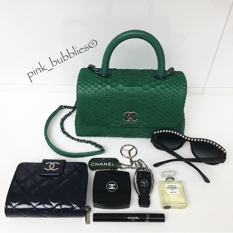 chanel mini coco handle generously take my small zipped wallet, car key, pearl detailed sunnies, mini bottle of gardenia for refreshing, and my latest favourite – rouge coco stylo! ?
