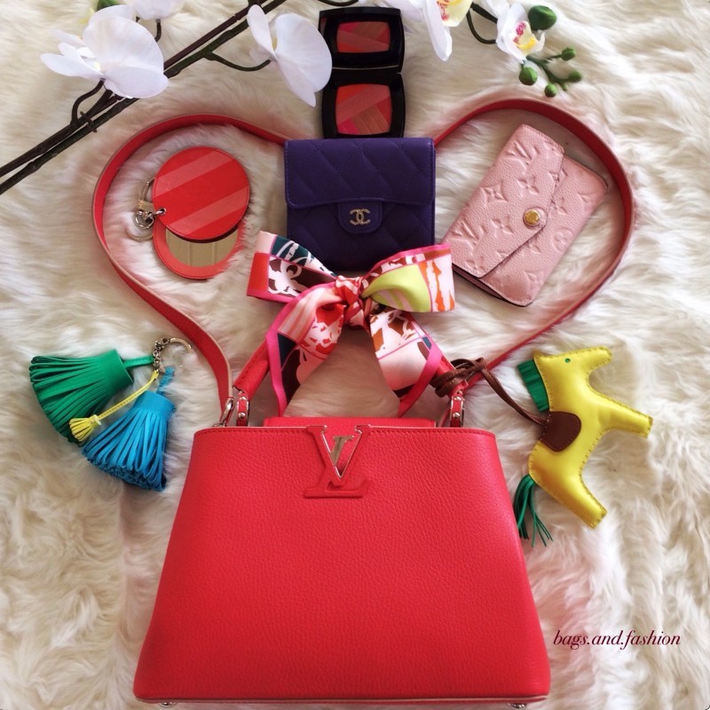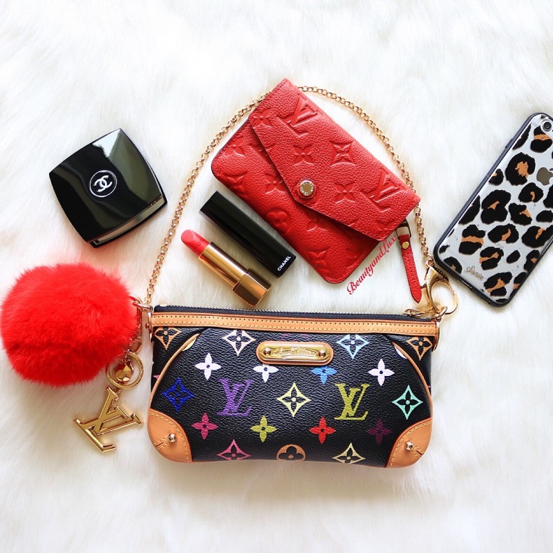 Joining the @pursebop fun with “What’s in my mini bag challenge” #PURSEBOPWIMMB ✨❤️✨ My mini is the LV milla clutch in multicolor Noir! She fits my Chanel compact mirror, Chanel Rouge Allure Velvet lipstick in La Malicieuse, LV empreinte cles in the color Cerise, and my IPhone 6 with the case! Perfect for a night out!✨❤️✨ I attached my red Pom Pom and LV Facettes charm to dress her up! ✨?❤️✨ #BeautyandLux IG:BeautyandLux