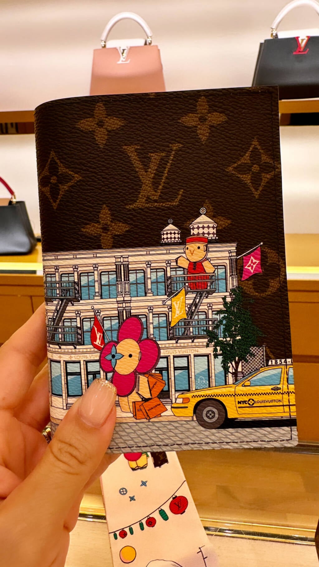 Every Holiday season, Louis Vuitton creates a special edition of small leather goods featuring Vivienne, the LV mascot. The playful and festive illustrations show Vivienne traveling in destinations across the globe. Louis lovers delight in this whimsical design, looking forward to collectsing their favorite travel destinations each year.