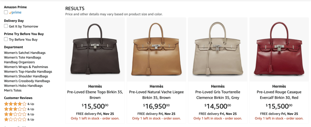 We knew it was coming, but sometimes you need to see it to believe it. Not gonna lie, it’s a bit weird. Along with homewares, socks, and laundry detergent, you can add a Hermès Birkin to your Amazon cart.