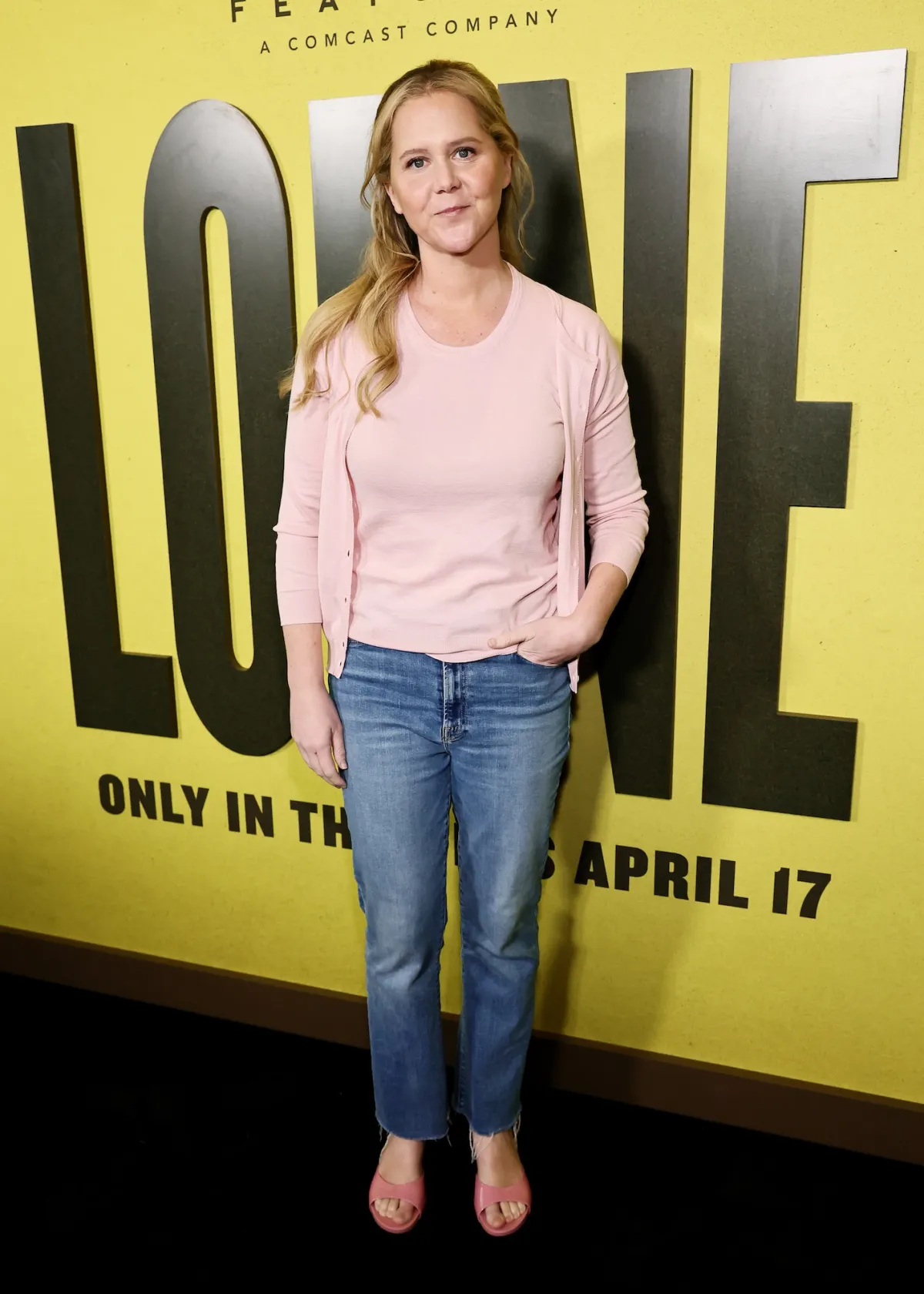 While getting her photograph taken, Schumer rocked a pastel pink top and matching cardigan from Prada. She styled the trendy shirt with blue Mother jeans and Barbie pink sandals.
