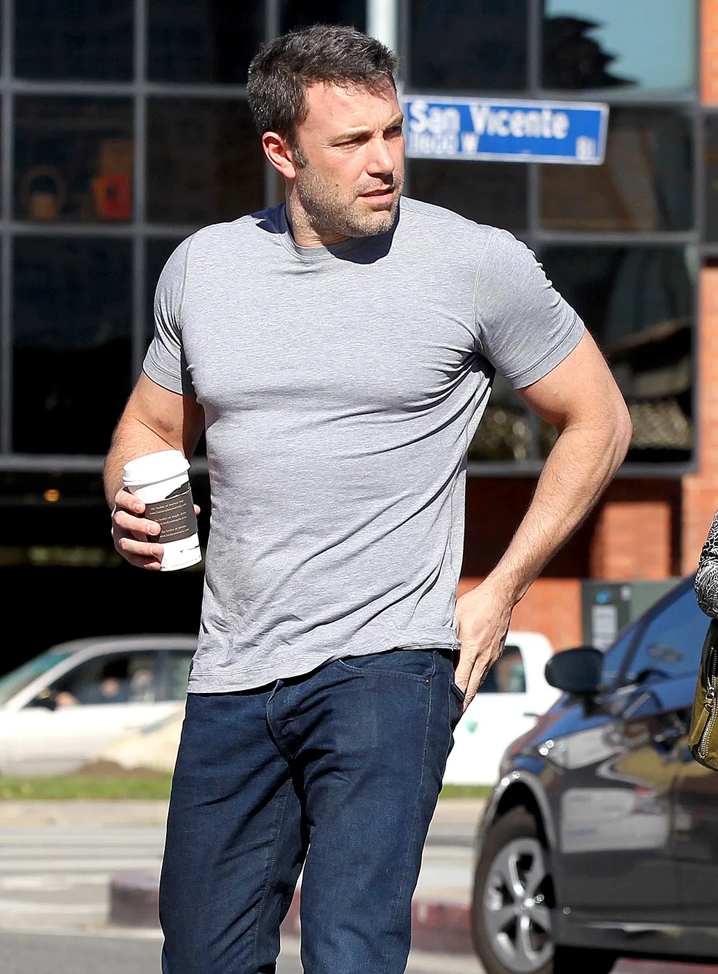 Affleck, who is currently filming Batman v Superman: Dawn of Justice (opposite fellow hottie Henry Cavill as the Man of Steel), gave onlookers a peek at his chiseled abs and bulging biceps in the snug top. He wore his salt and pepper hair short and had plenty of facial scruff. The Oscar winner paired his eye-catching top half with fitted dark wash jeans and navy sneakers.