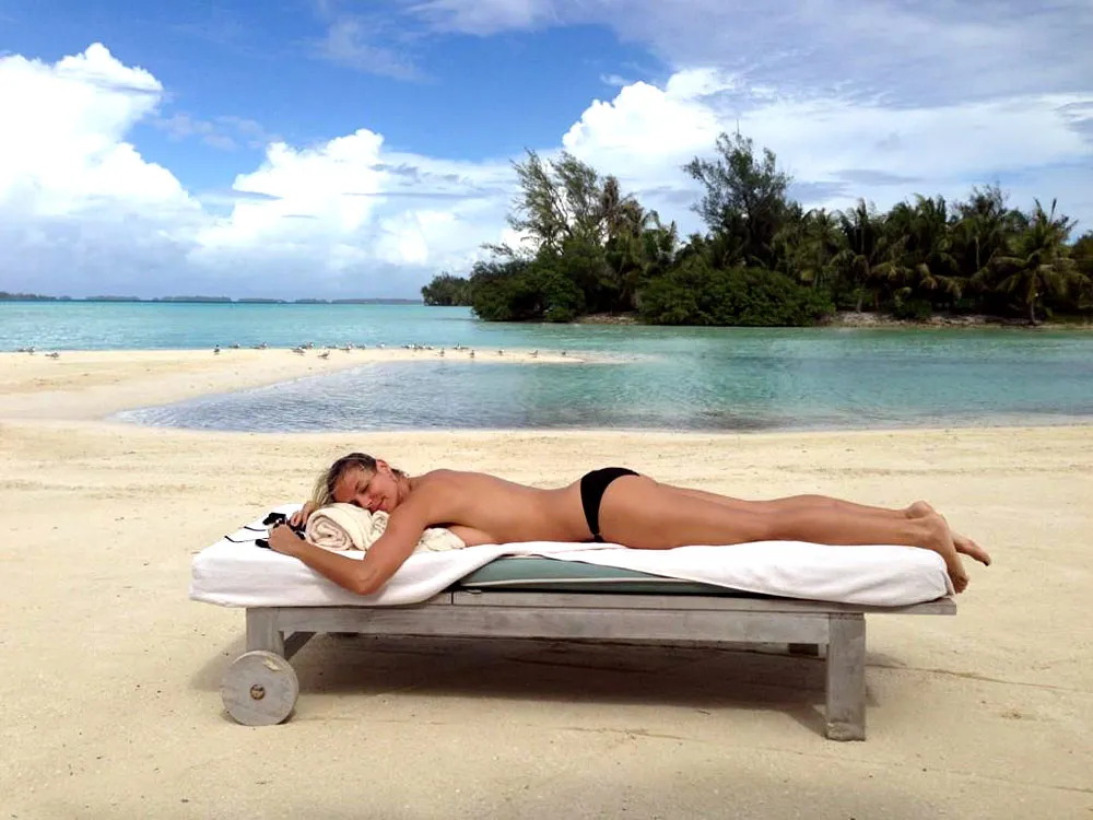 "Island speed," she captioned the shot, which showed her lying on her stomach, tanning topless in only black bikini bottoms.