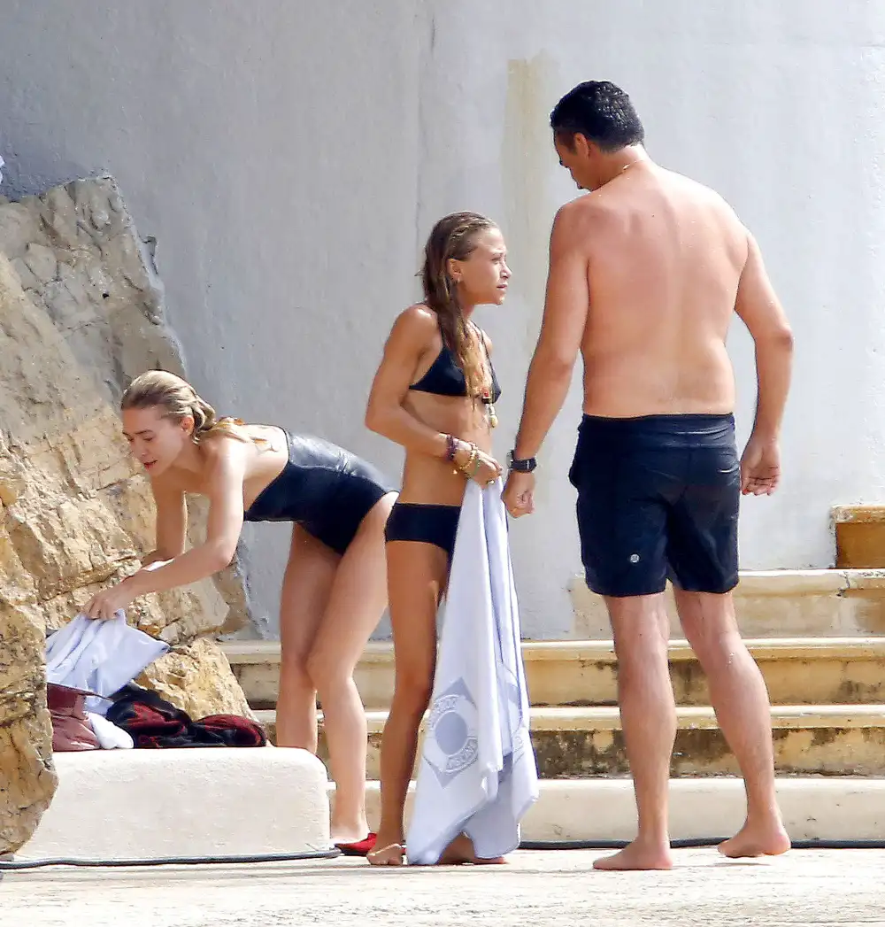 The 30-year-old twins flaunted their svelte frames in black bathing suits during their day of fun in the sun. While Ashley rocked a sexy one-piece, Mary-Kate showed off a bit more skin in a teeny-tiny bikini, accessorized by an array of boldly colored bangles and necklaces. The famous sisters were joined by Mary-Kate’s husband, Olivier Sarkozy, who couldn’t help but swim a few laps himself.