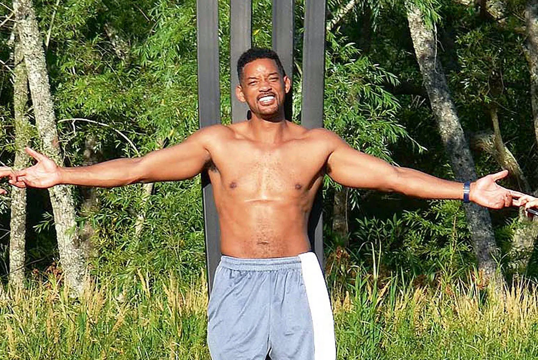 Wearing just a pair of gray basketball shorts and sneakers, the I Am Legend actor displayed his buff biceps and washboard abs as he and other members of his group posed atop a circle of towering iron chairs. With his arms extended out to the side, he linked fingers with his companions and flexed his impressive muscles.