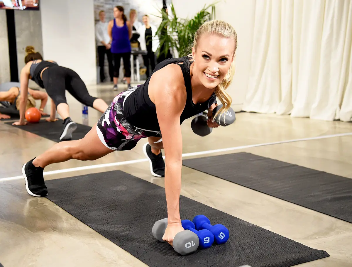 “Carrie works out hard. Carrie is disciplined,” Nashville-based trainer Erin Oprea tells Us. “Carrie does weight training of all different variations — and lunges and squats.” The five-foot-three Grammy winner also makes sure her arms are supersculpted. “I used to curl 8 pounds, now I’ve been curling 20!” the Cry Pretty singer tells Us of her six-days-a week 90-minute workouts, which include shoulder presses, dumbbell rows and pullups.
