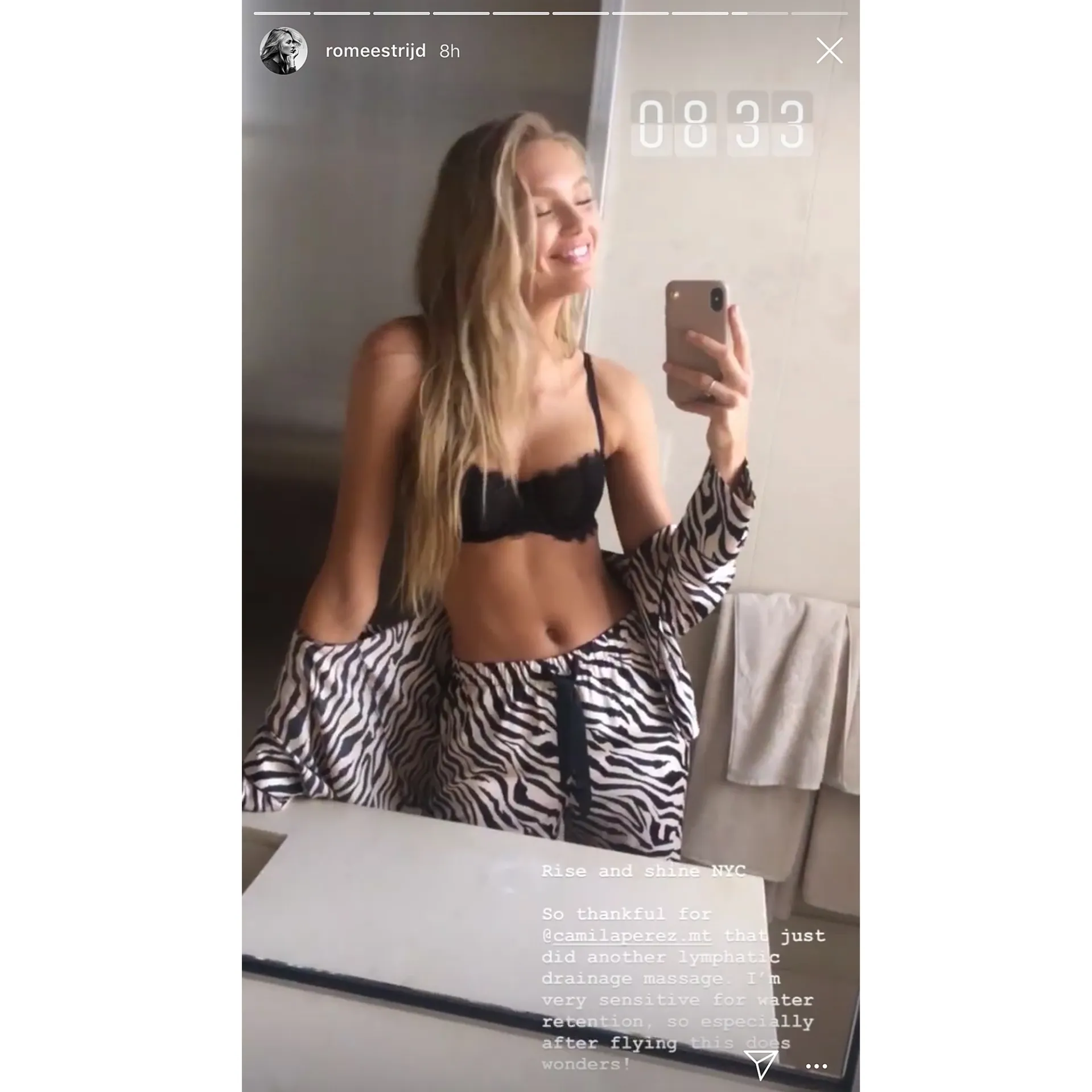 The Victoria’s Secret Angel showed the world how a #mirrorselfie is done right! On September 6, 2019, Strijd shared an Instagram Story image of herself in NYC with her pajama top casually dropped around her shoulders, revealing a lacy black bra and a toned midsection heading into New York Fashion Week. Telling viewers she’d recently had a lymphatic drainage massage, she noted it helps with bloating. “I’m very sensitive for water retention,” she wrote, “so especially after flying this does wonders.”