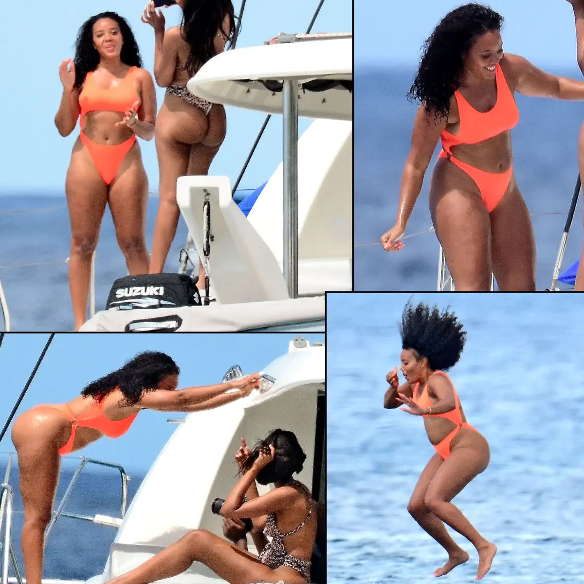 The Growing Up Hip Hop star enjoyed a day on the ocean with friends in Barbados on Thursday, February 7. In a bright orange, cut-out one-piece that looks like a bikini, Simmons, 31, sunned herself with pals, jumped from their catamaran and rode a jet ski.