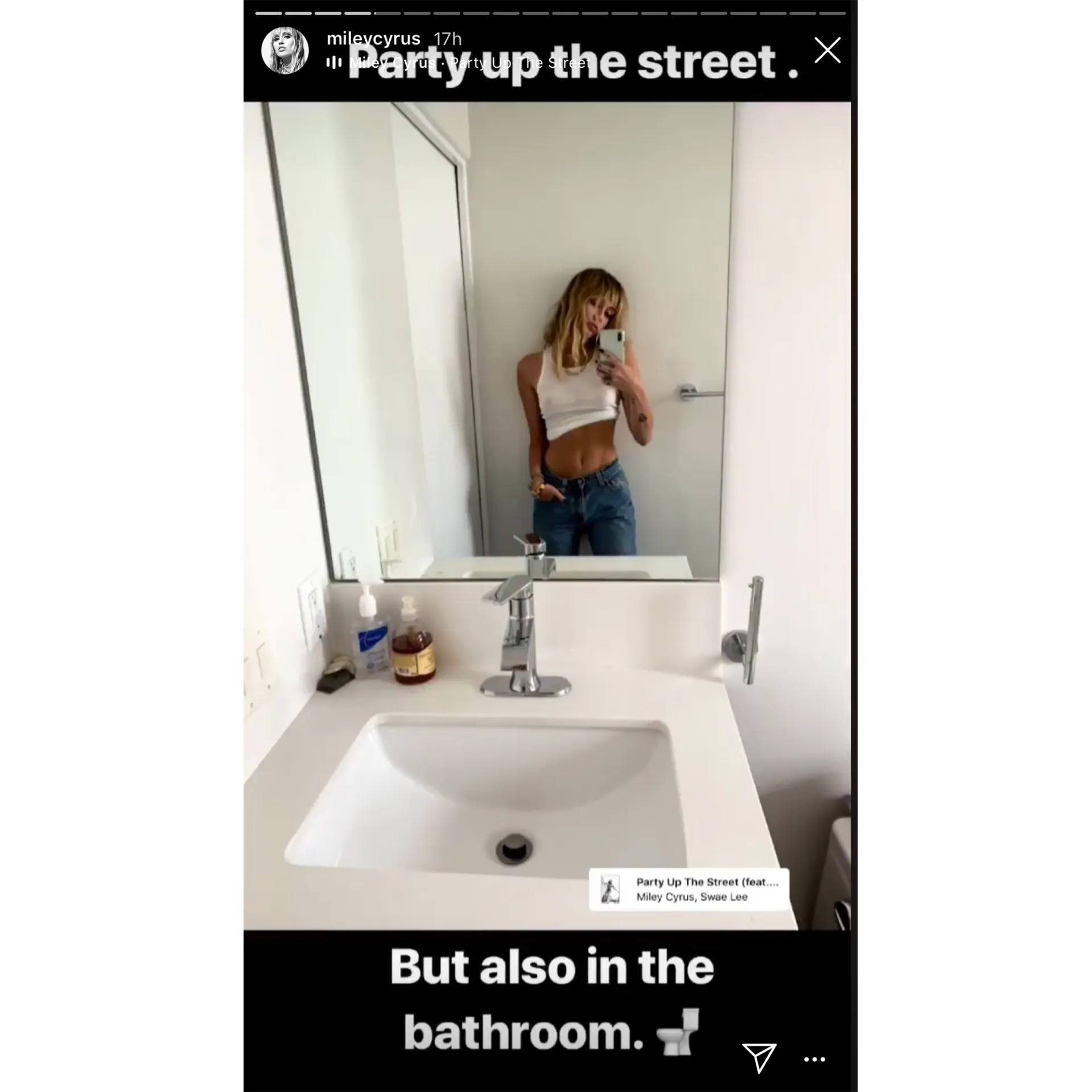The She Is Miley Cyrus artist isn’t messing around! On July 18, 2019, the singer posted a bathroom mirror selfie on her Instagram Stories. In the pic, she’s wearing low-slung jeans and has pulled up her white tank top to reveal a serious six-pack. “Party up the street,” she typed over the photo. “But also in the bathroom. 🚽”