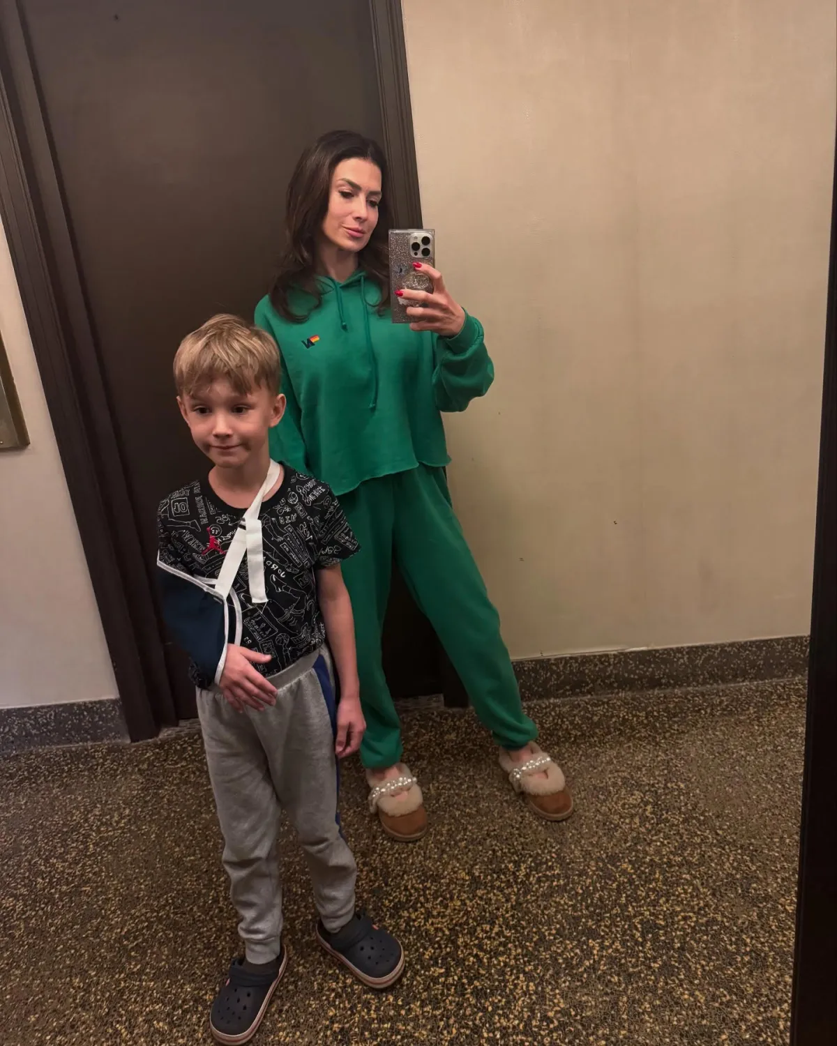In Hilaria’s upload, she and Romeo posed for a mirror selfie where one of the elementary schooler’s arms was resting in a navy-colored sling. Later on Saturday, Hilaria shared another image of Romeo alongside a “Love You” sticker.