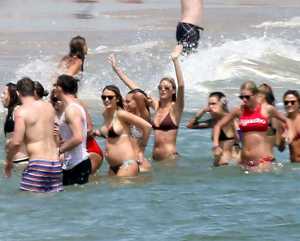 The Shallows star, 28, took a dip in the Atlantic Ocean with her hunky hubby, 39, and put her growing belly on display in a tiny two-piece. The second-time parents-to-be — who welcomed daughter James in December 2014 — embraced each other and snuck in a few smooches near Swift’s seaside mansion in Watch Hill, Rhode Island.