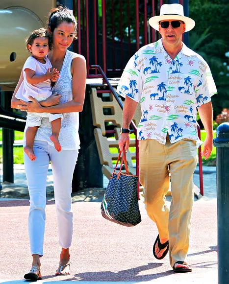 The usually stoic actor couldn't wipe a goofy grin off his face as he enjoyed the sunny weekend with his two gals, even opting to ditch his usual wardrobe for more dad-friendly fare.