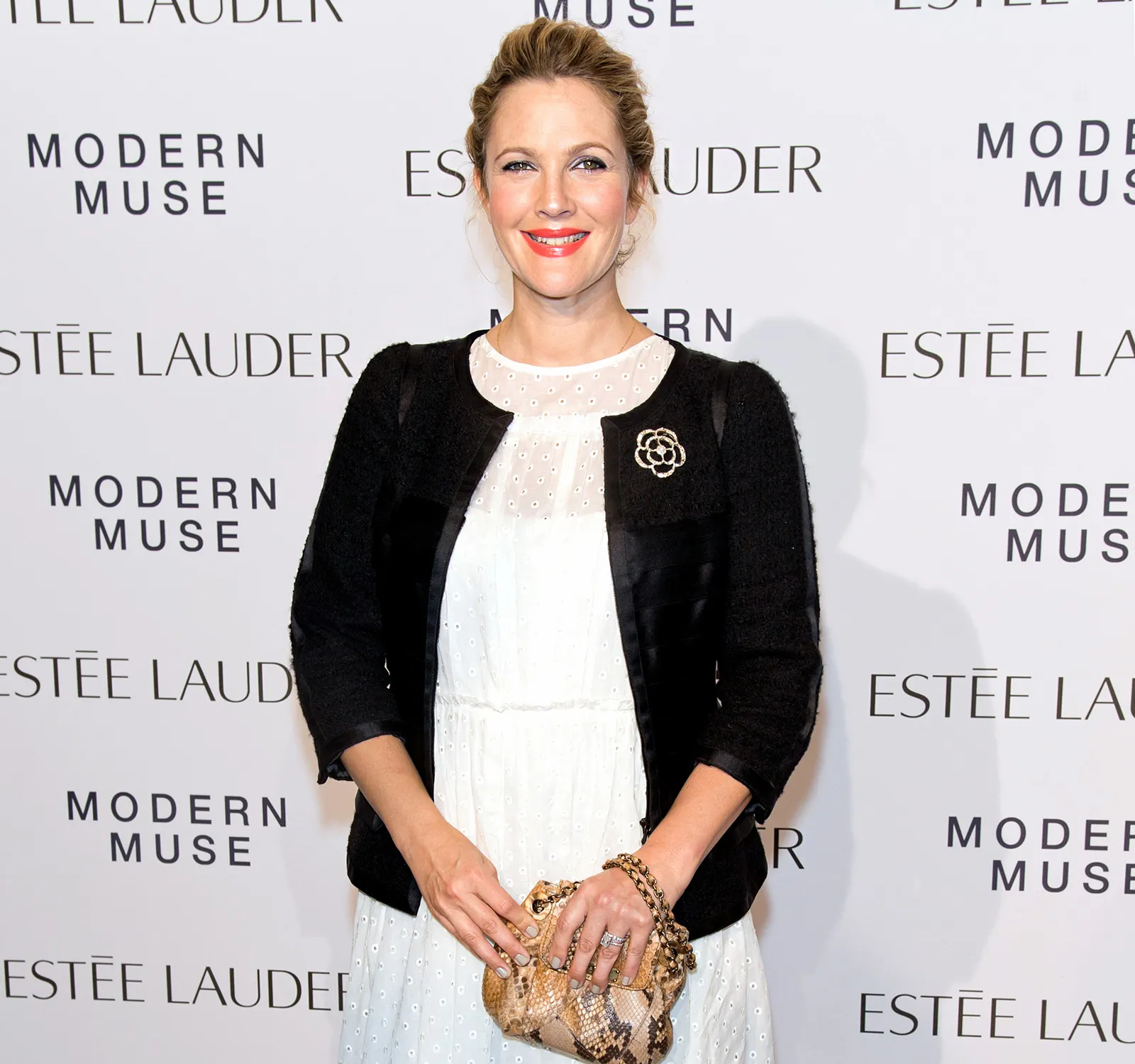 The first-time mom looked stunning at the NYC event red carpet. Barrymore wore a white dress and shoes by Marc Jacobs, a black jacket by vintage Chanel and a golden purse for the night out, and even dabbled in her very own Flower Beauty Line for her makeup.