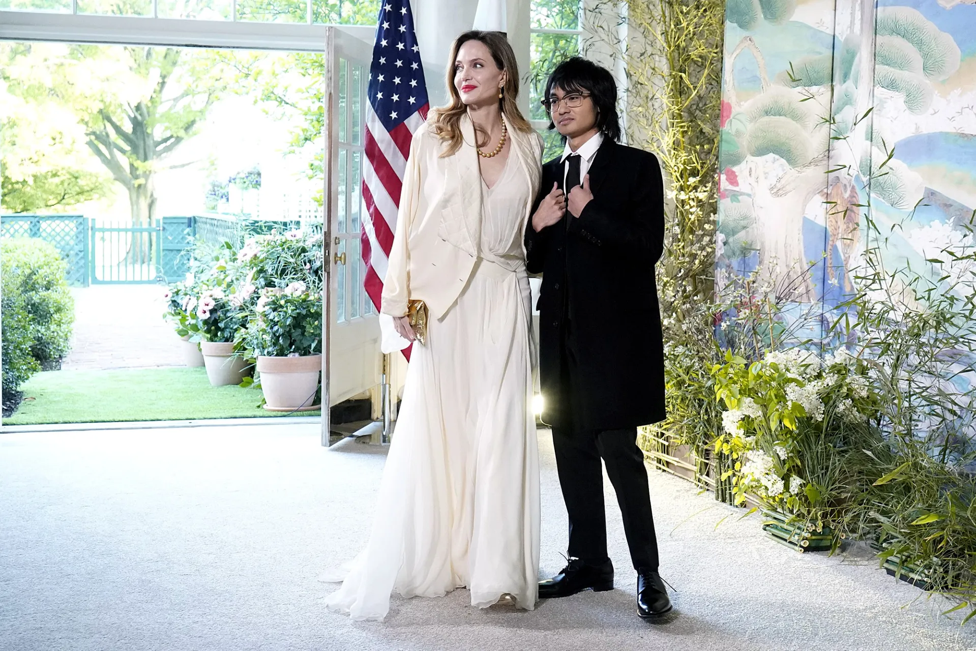 The Maleficent actress, 47, stunned on the white carpet in a matching white gown and coordinating blazer on Wednesday, April 26. Jolie completed her look with a string of pearls and a gold clutch as she entered the White House with her and ex-husband Brad Pitt’s 21-year-old son. Maddox, for his part, looked dapper in a black suit that featured a long jacket.