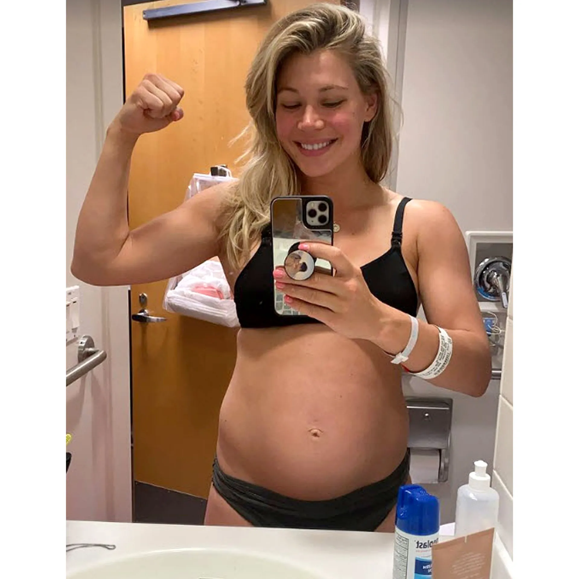 The former ABC personality showed her bare stomach from all sides in the social media uploads while wearing a black nursing bra and matching underwear. The Montana native flexed in the final photo, showing off her “strong” body.