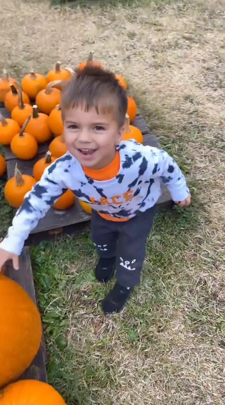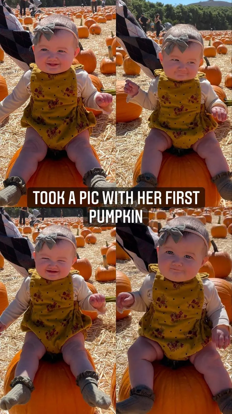 Jacobs was all smiles while posing in front of a scarecrow with her newborn in the social media upload as Grayson cried in her arms. He sported a green shirt and gray pants.