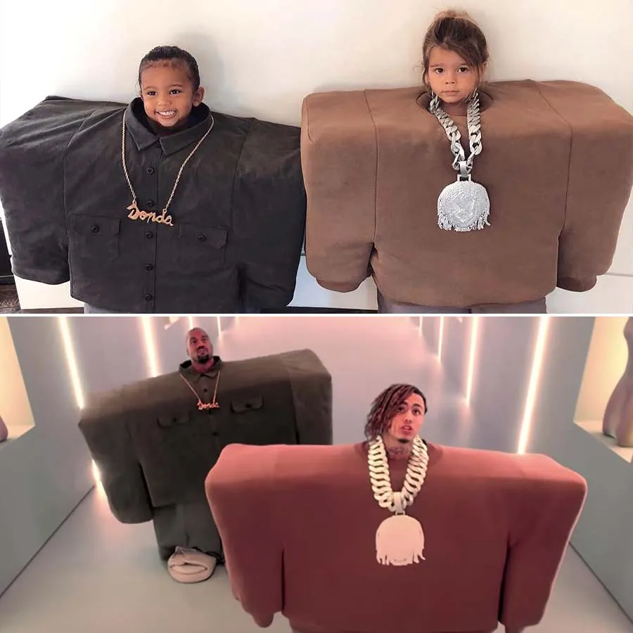 As for West, both the rapper’s eldest son, Saint, and his nephew Reign modeled their 2018 Halloween outfits after his “I Love It” music video. The cousins could barely stay upright while wearing the oversized shirts, pants and Yeezys.