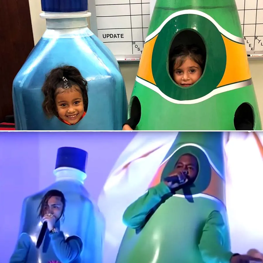 Since the Grammy winner and his collaborator Lil Pump wore massive Fiji and Perrier water bottles onstage while performing the song, West’s daughter North sported a similar outfit that same year. Kourtney Kardashian and Disick’s daughter, Penelope, hilariously matched her.