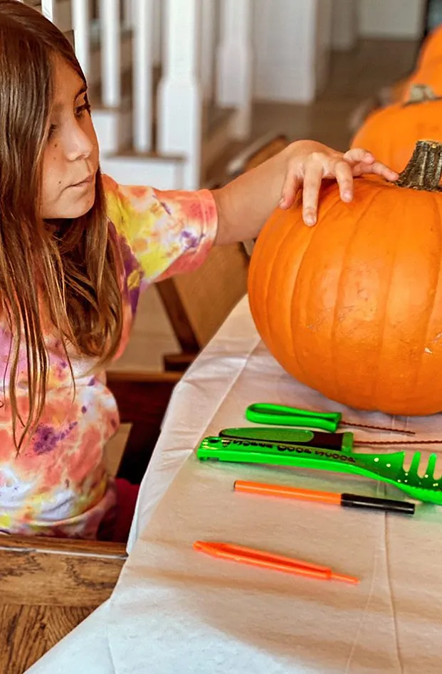 The Gracefully You author went on to show her daughter, Everly, hard at work scooping seeds out of her pumpkin.