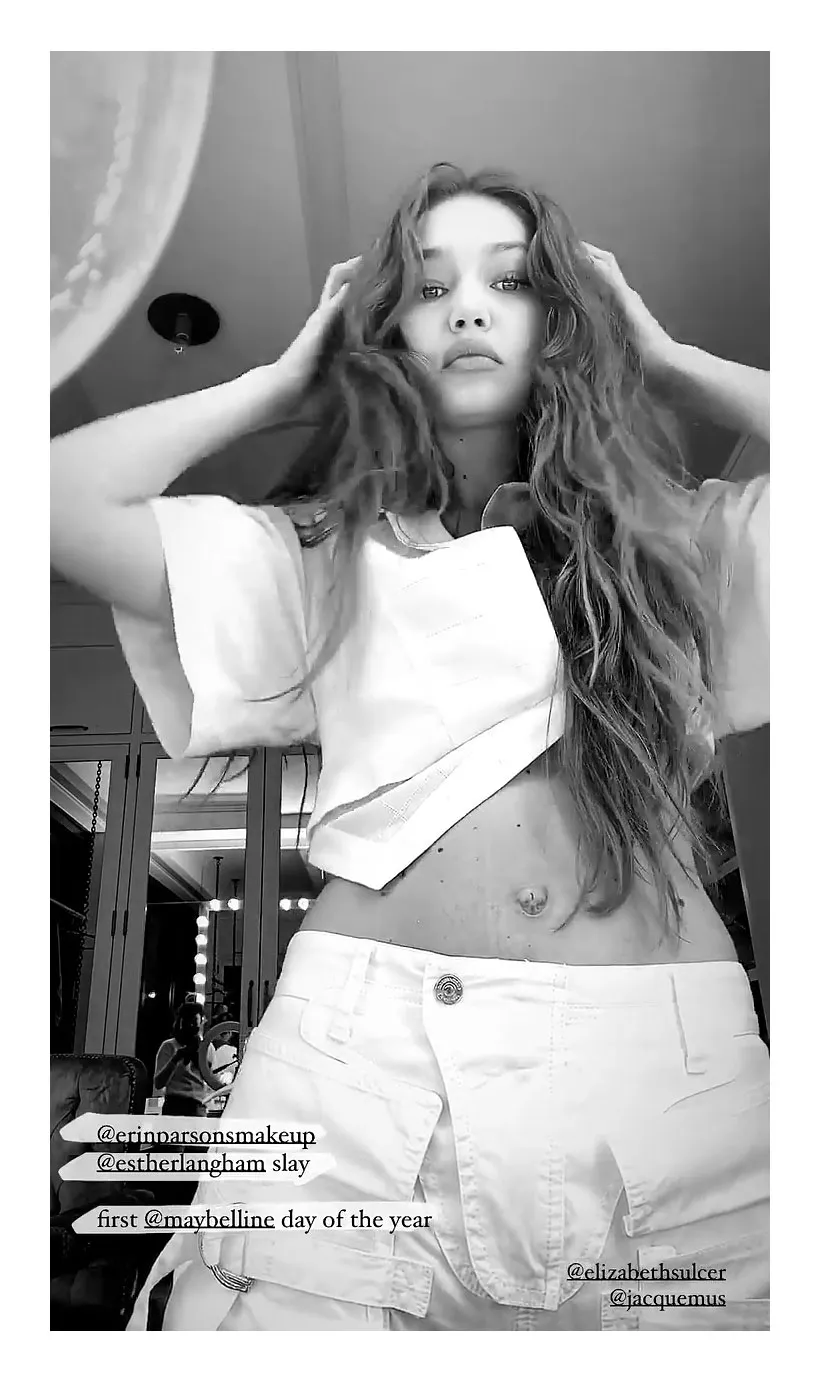 The 25-year-old model gave a closer look at her flat belly via her Instagram Stories, as she shared a black-and-white video of her hair and makeup for the day.