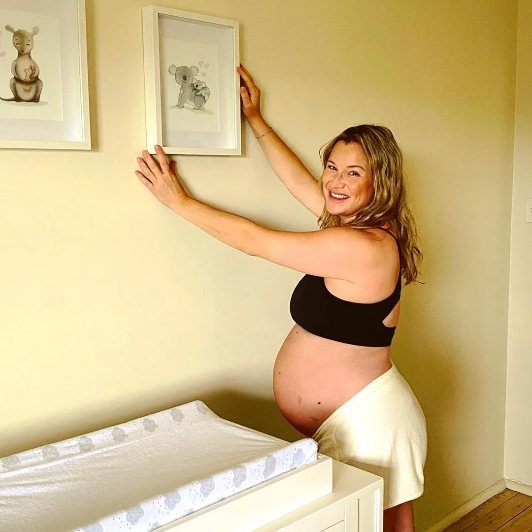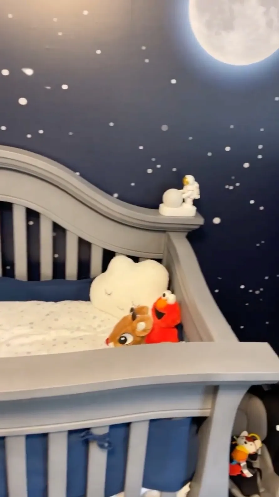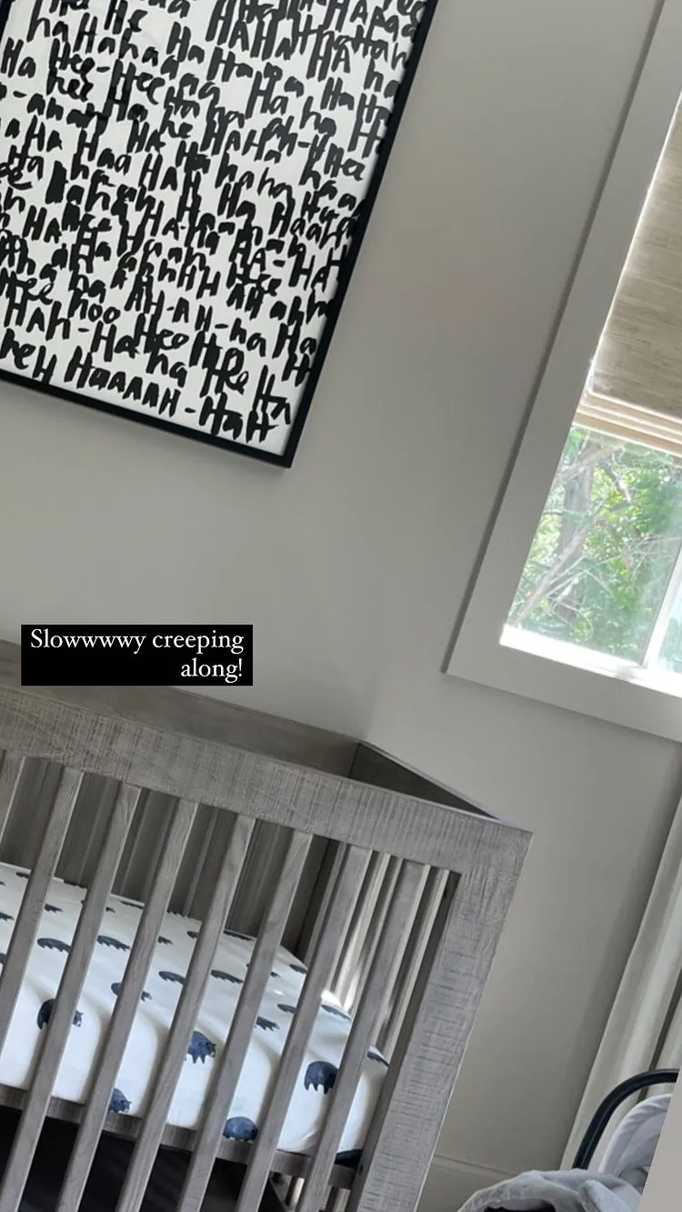 The then-pregnant star, who welcomed her baby boy later that same month, cradled her baby bump in a pink dress while showing off the room. The room included a white crib, matching dresser and couch, as well as framed animal art, a gold map and patterned wallpaper.