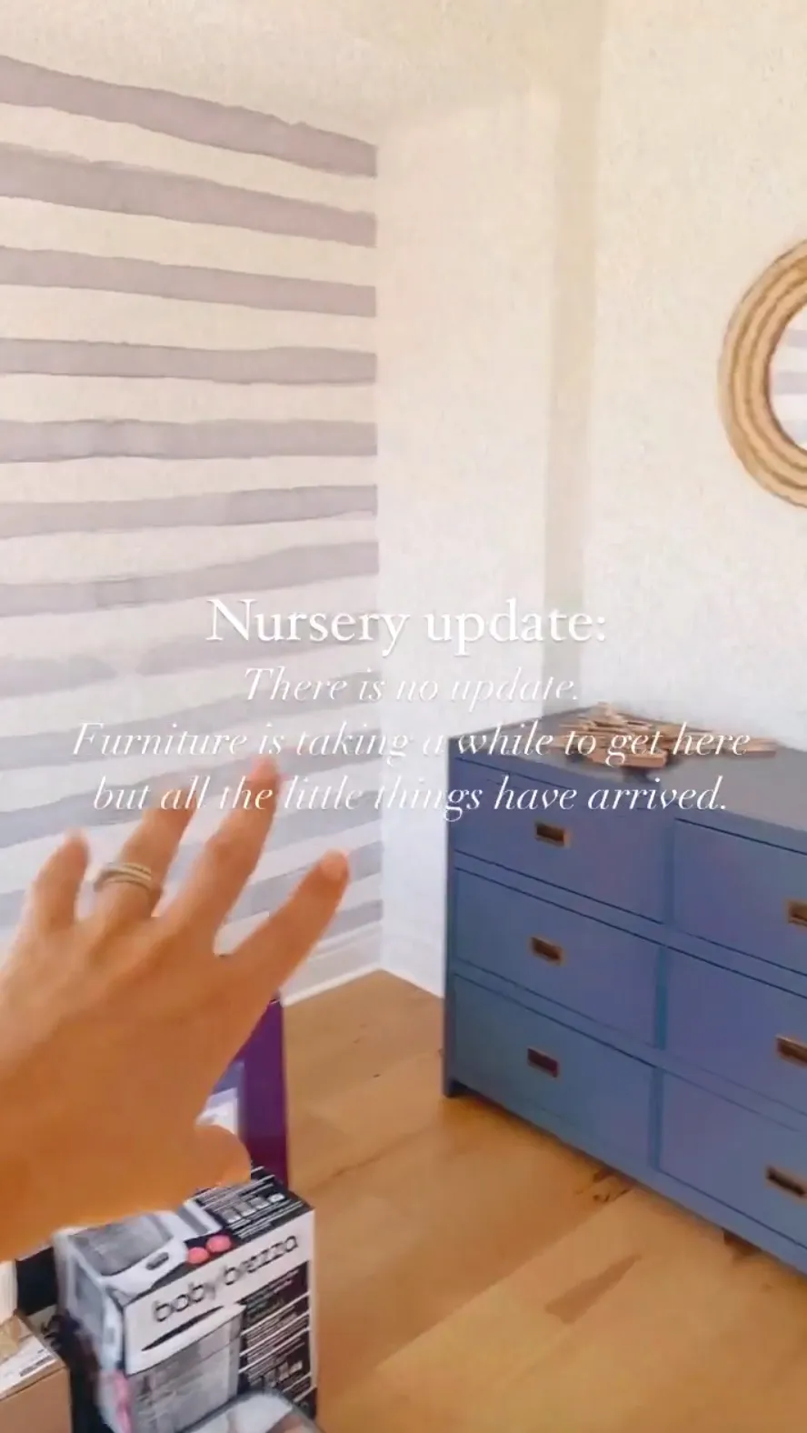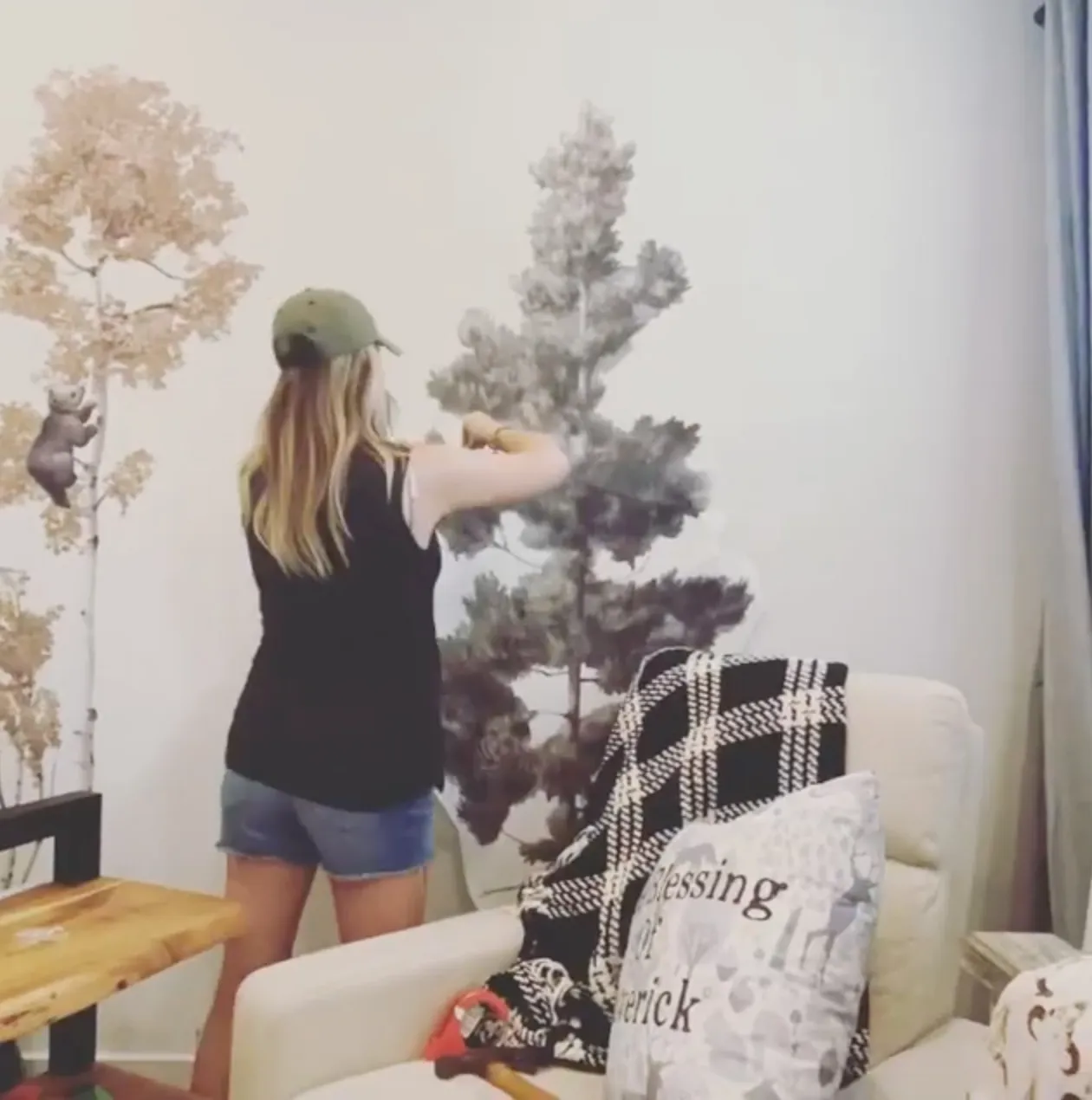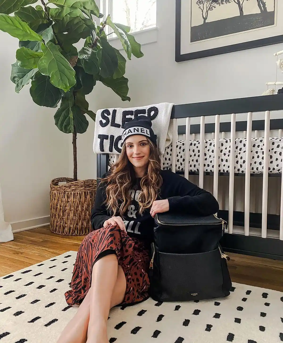 The then-pregnant star, who welcomed her baby boy later that same month, cradled her baby bump in a pink dress while showing off the room. The room included a white crib, matching dresser and couch, as well as framed animal art, a gold map and patterned wallpaper.