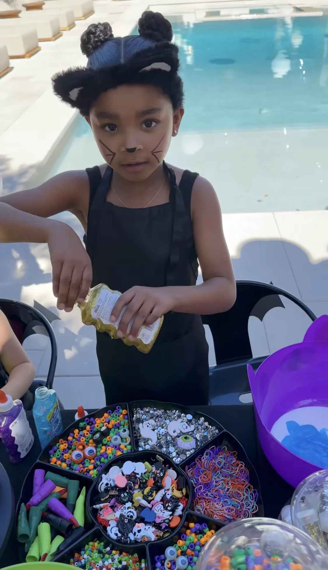 True and cousin Reign (Kourtney Kardashian and Scott Disick‘s youngest son) kept busy at the slime table, adding glitter and colors to their creations. Other photos revealed a coloring station, and the little ones also had space to run around the backyard. North, 10, Kim’s eldest daughter, was spotted on the trampoline with several other kids.