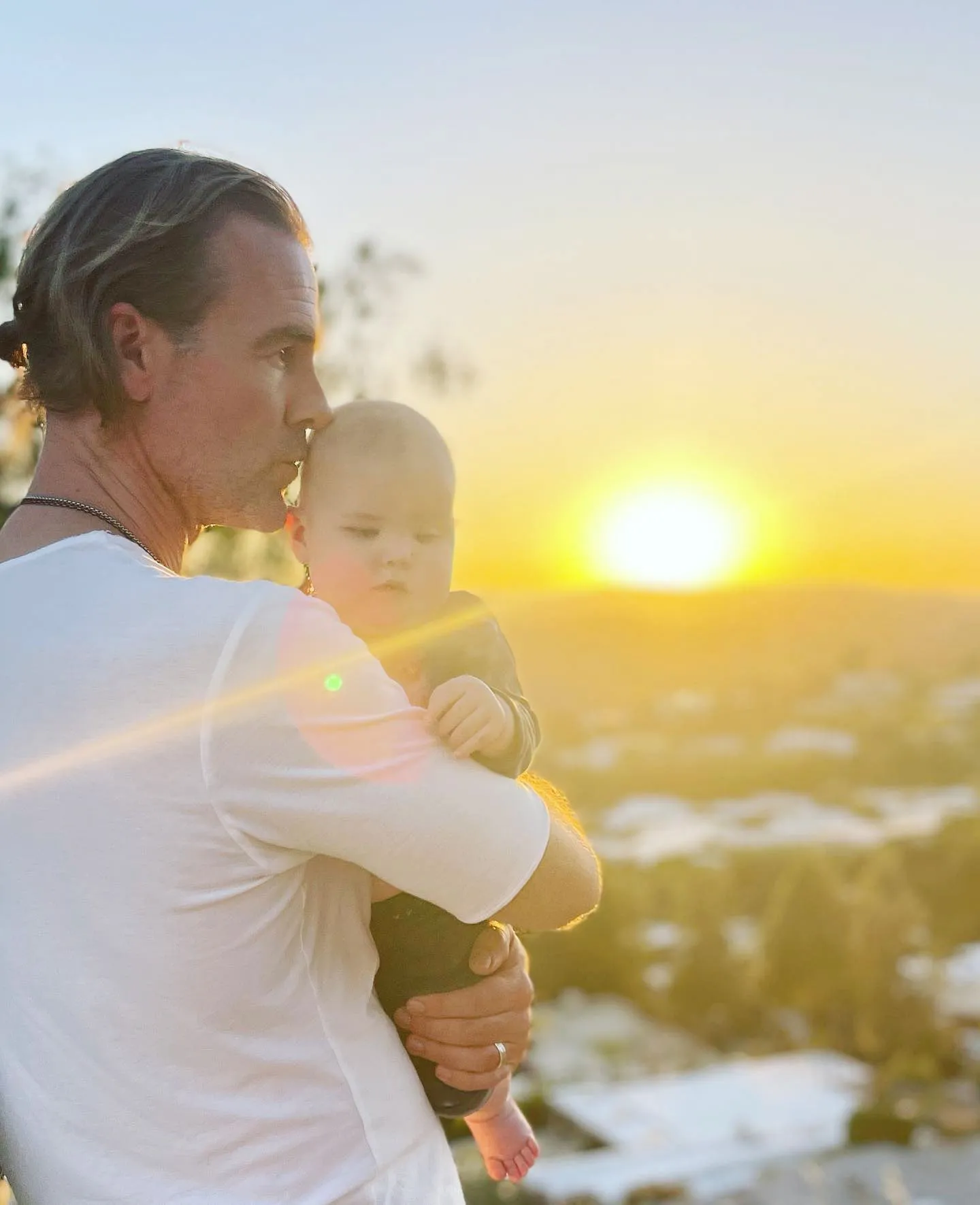 In the social media upload, James kissed his baby boy’s forehead while watching the sunset.