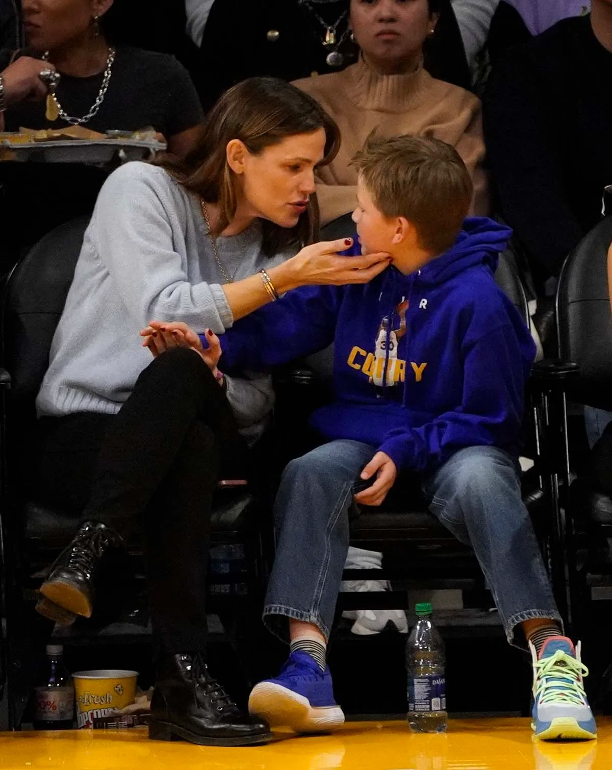 The Alias alum, 50, watched the Los Angeles Lakers face off against the Golden State Warriors at the Crypto.com Arena (formerly the Staples Center) on Sunday, March 5. Garner sat at courtside with Samuel, 11, who rocked a blue sweatshirt with Stephen Curry‘s name on the front. (The Warriors lost 105-113.)