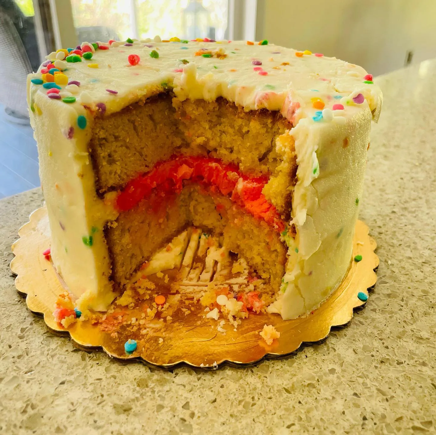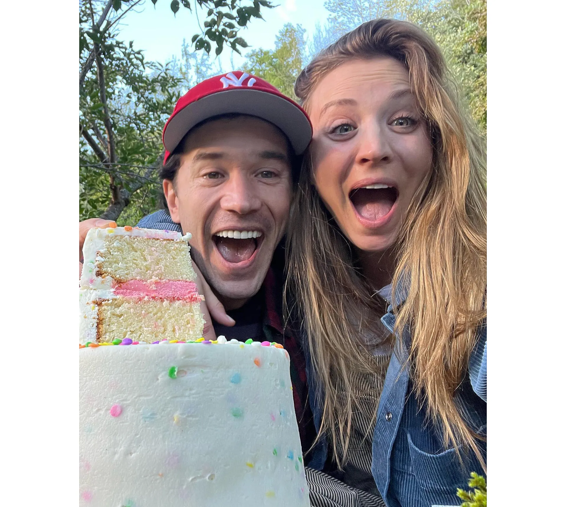 In one photo, Cuoco beamed as her beau held up a slice of cake, presumably made for a sex reveal party. The icing in the middle was pink, indicating that the couple are expecting a daughter.