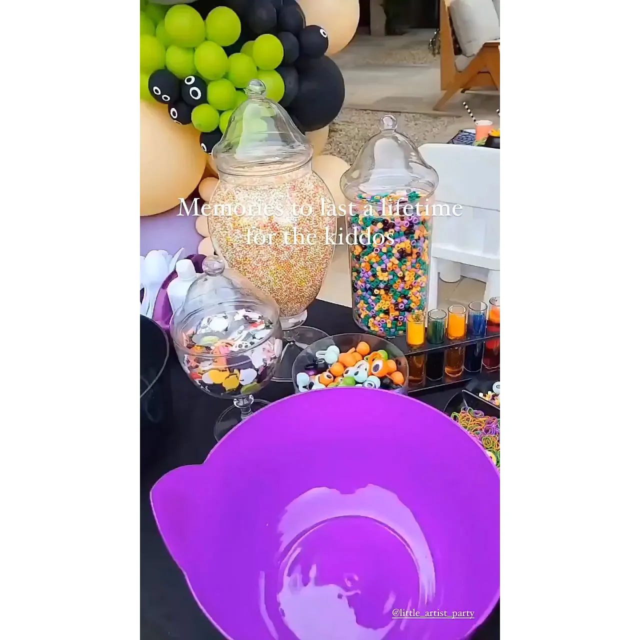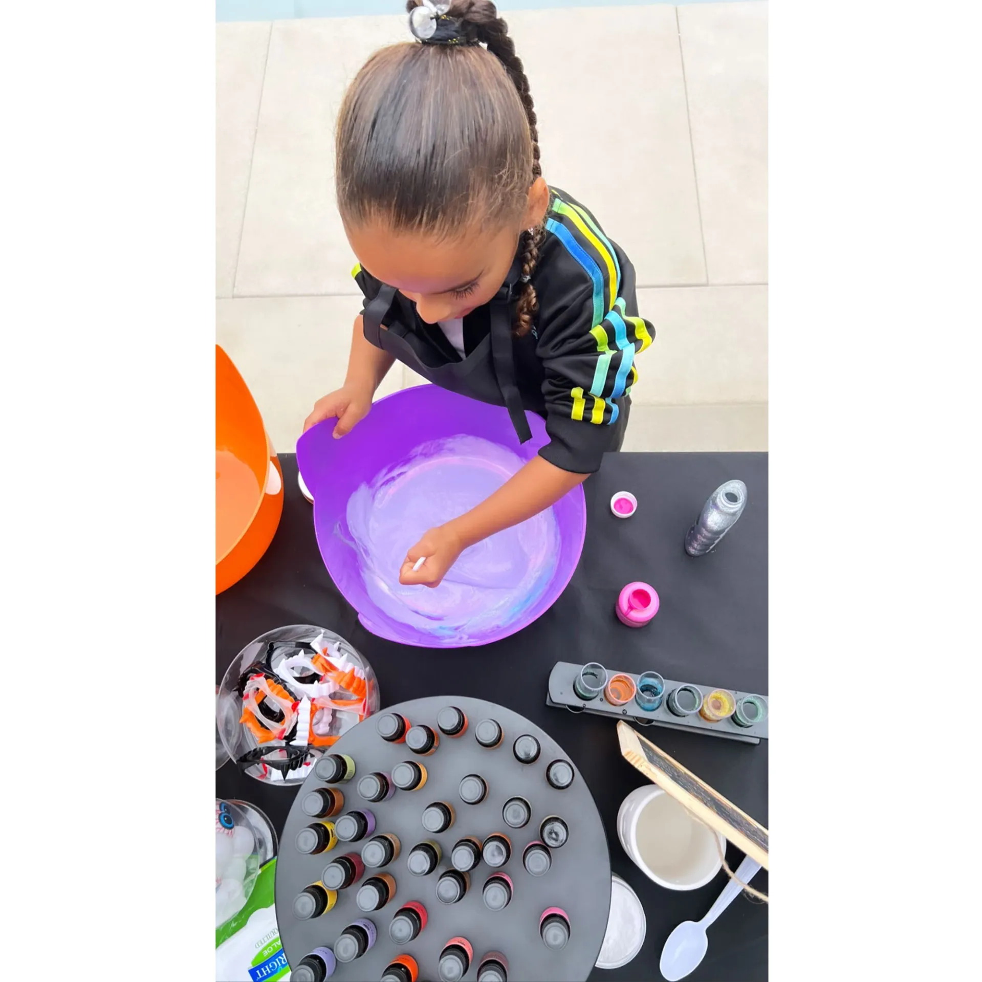 In addition to black, purple and green balloon arches — complete with cartoon balloon spiders — and a mini pumpkin patch, Kardashian revealed that the little ones would be able to tuck into ghost-shaped confections while making spooky, scented slime.