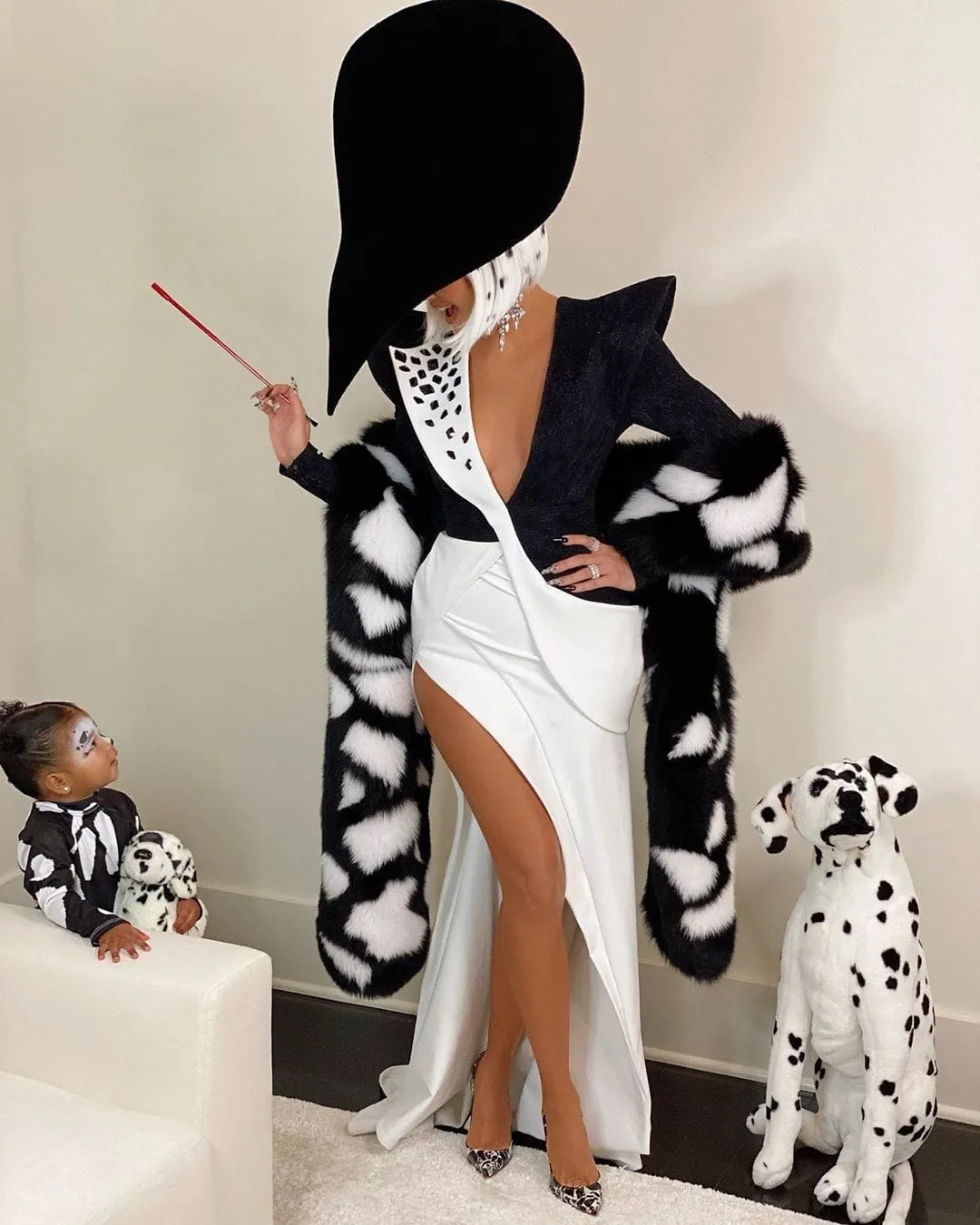 “101 Dalmatians,” the Keeping Up With the Kardashians star, 39, captioned her Thursday, October 31, Instagram post. In the series of photos, the Revenge Body host rocked a spotted white wig, a large black hat and an elaborate black and white dress. Her toddler paired a spotted bodysuit with black boots, face paint and a stuffed dog.