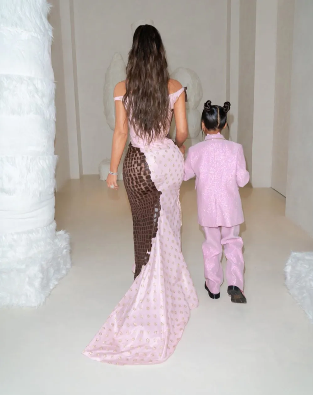 In the reality star’s social media upload, North looked down while posing for photos in her pink suit and space buns.