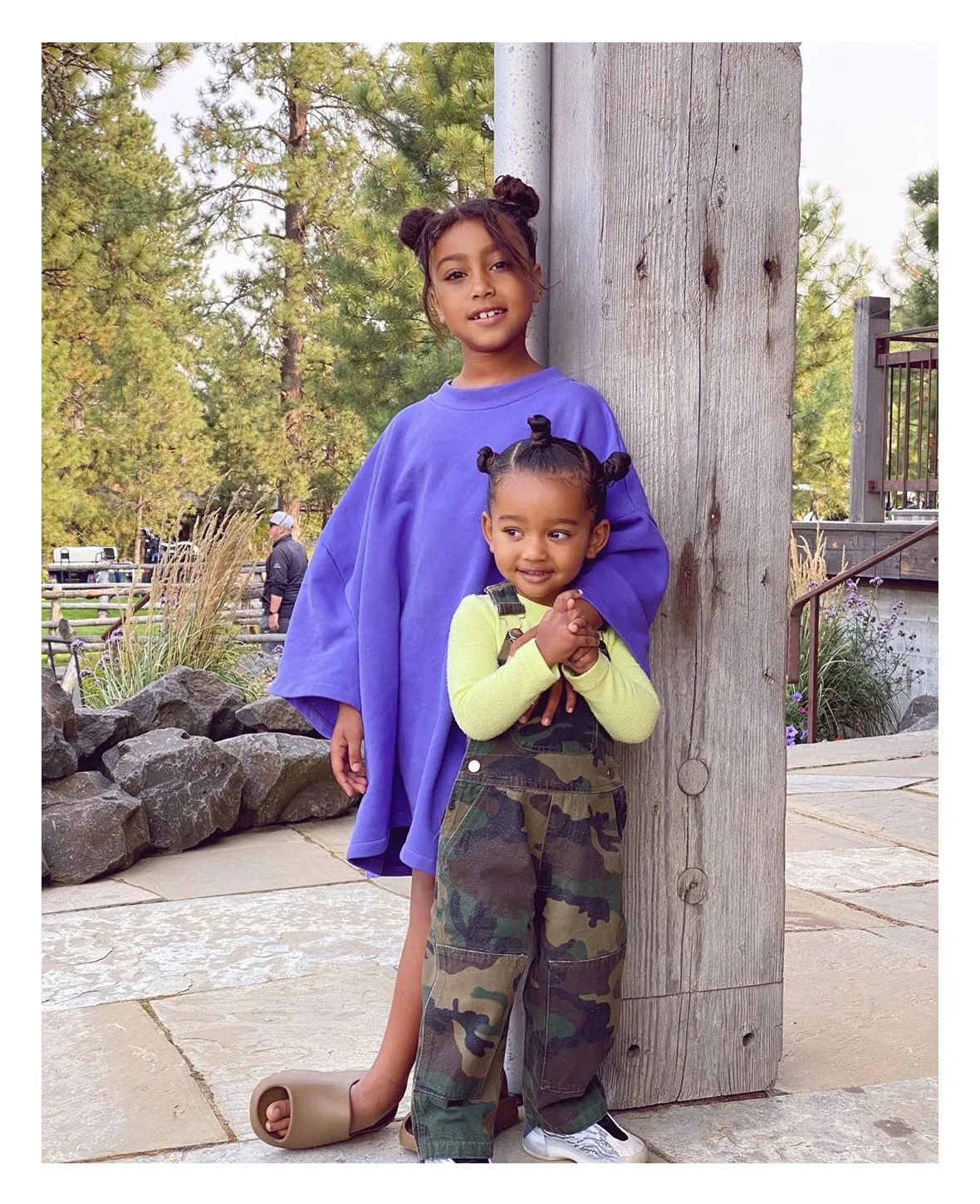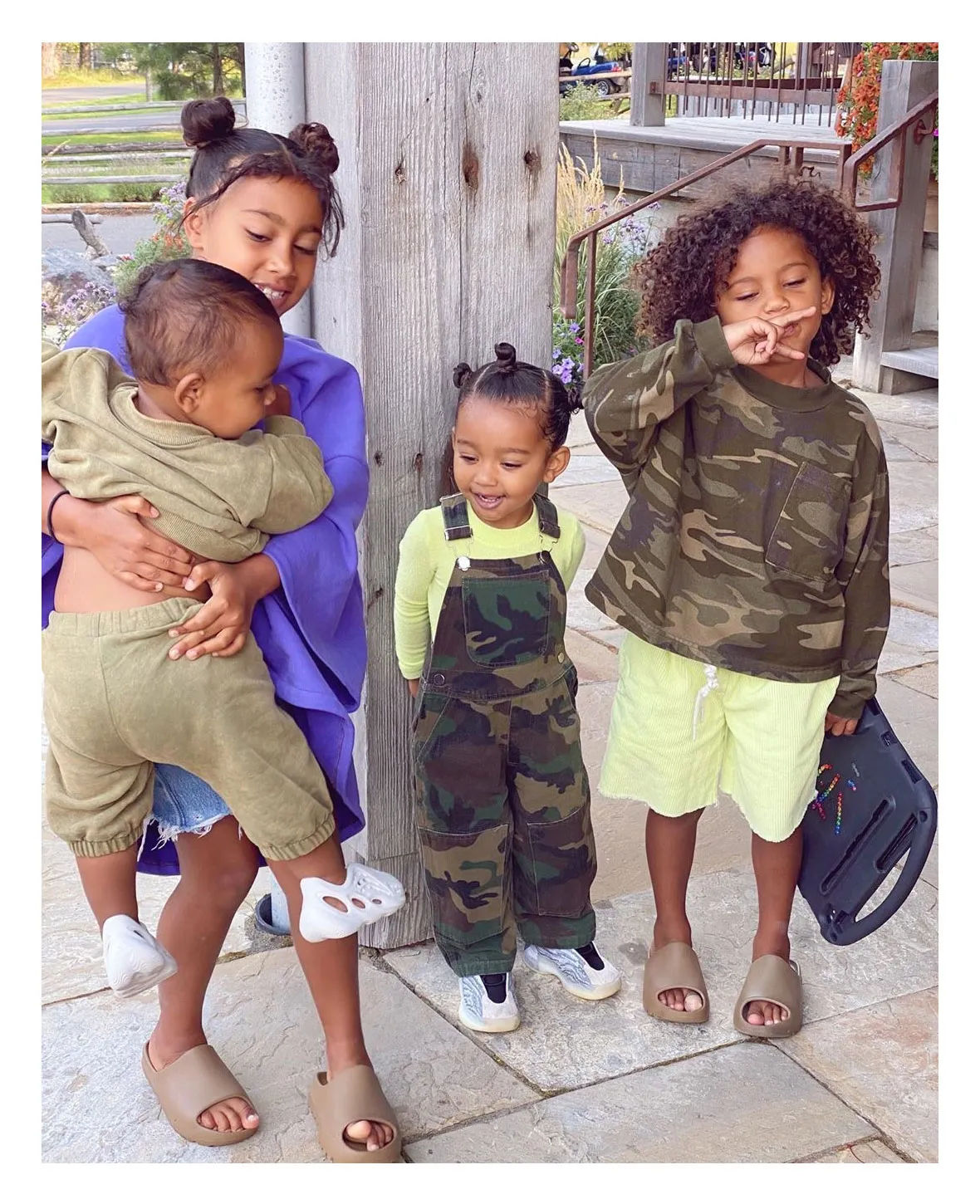 In one of the sweet shots, Kardashian’s husband, Kanye West, knelt beside their little ones and helped Psalm stand.