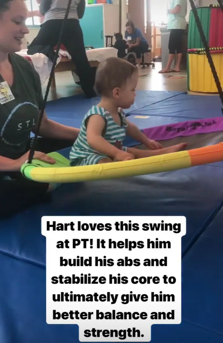The former Real Housewives of Orange County star, 34, posted a clip of her 13-month-old, writing, “Hart loves this swing at PT! It helps him build his abs and stabilize his core to ultimately give him better balance and strength.”