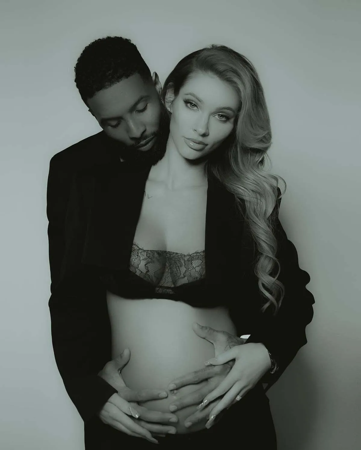 In the black-and-white social media upload, the professional football player, 29, cradled his partner’s bare bump. The Louisiana native wore a suit, while the expectant star rocked black lingerie.