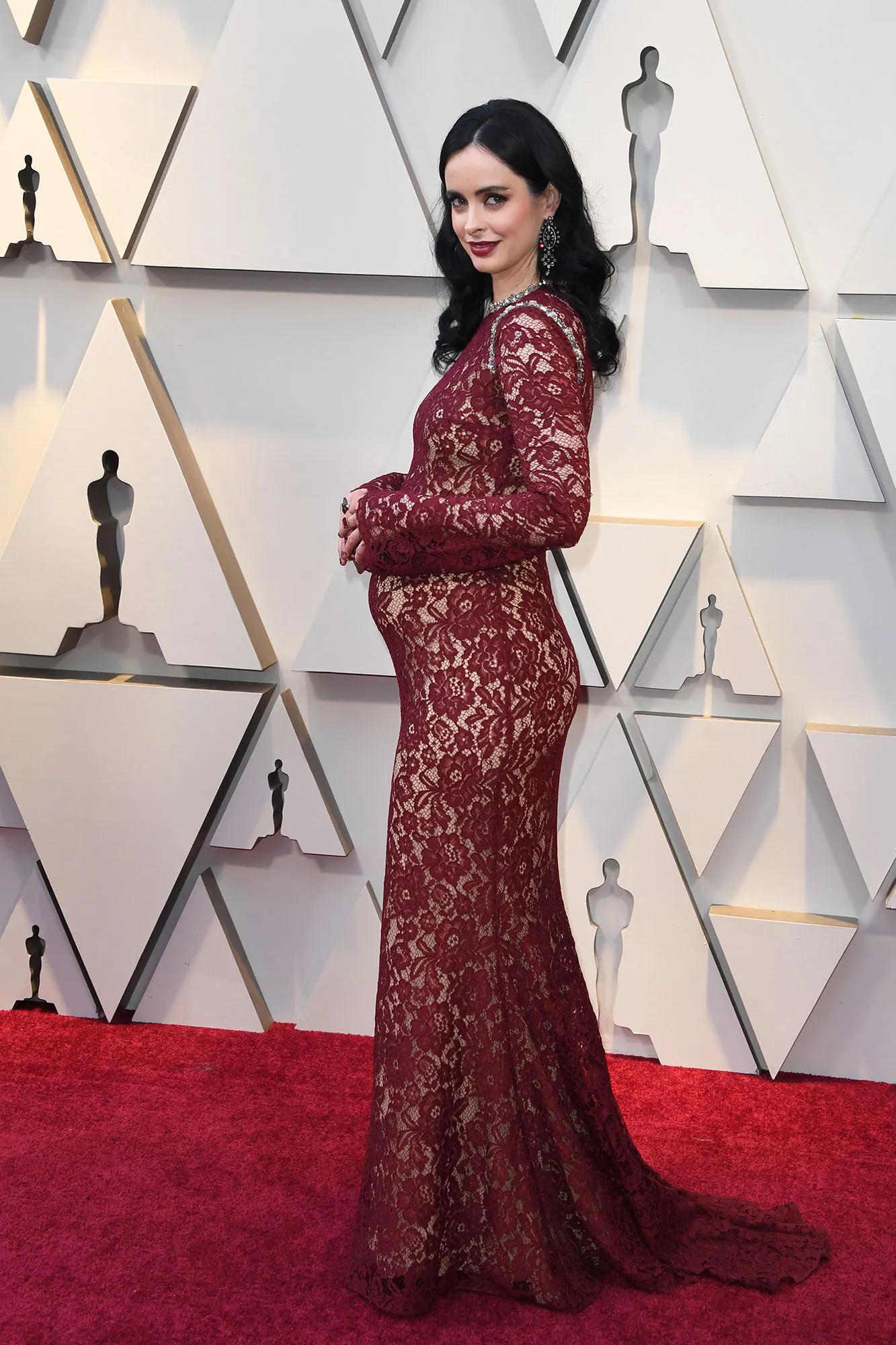 The Jessica Jones star, 37, debuted her baby bump in a long-sleeve red lace gown while walking the carpet with her boyfriend, Adam Granduciel.
