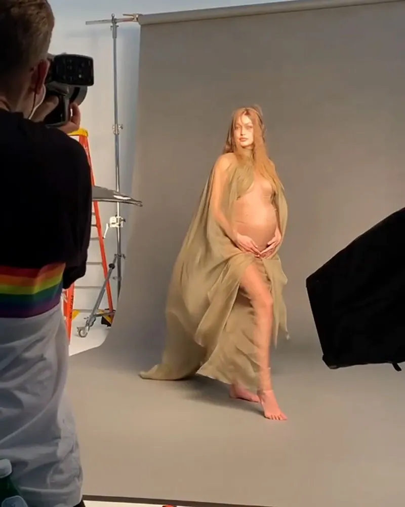 In the photos, Hadid cradled her stomach in multiple sheer outfits.