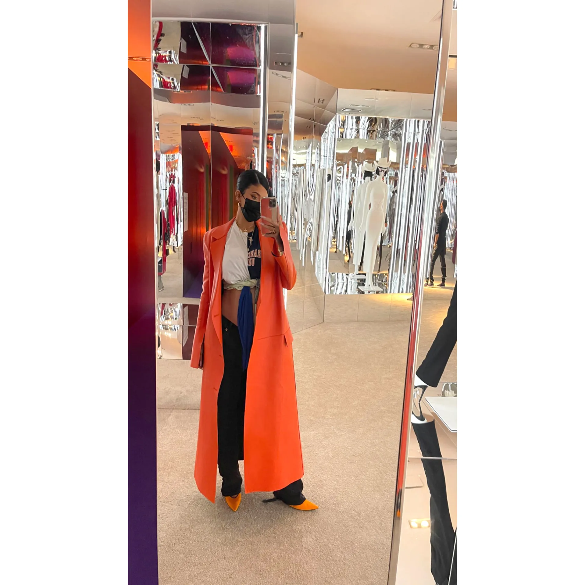 “So excited to support my friends @revolve on their amazing New York Fashion Week presentation,” the Keeping Up With the Kardashians alum, 24, captioned a red carpet photo from the event via Instagram. The Los Angeles native showed her stomach in a cropped white top, which she paired with black pants, an orange coat and matching heels.