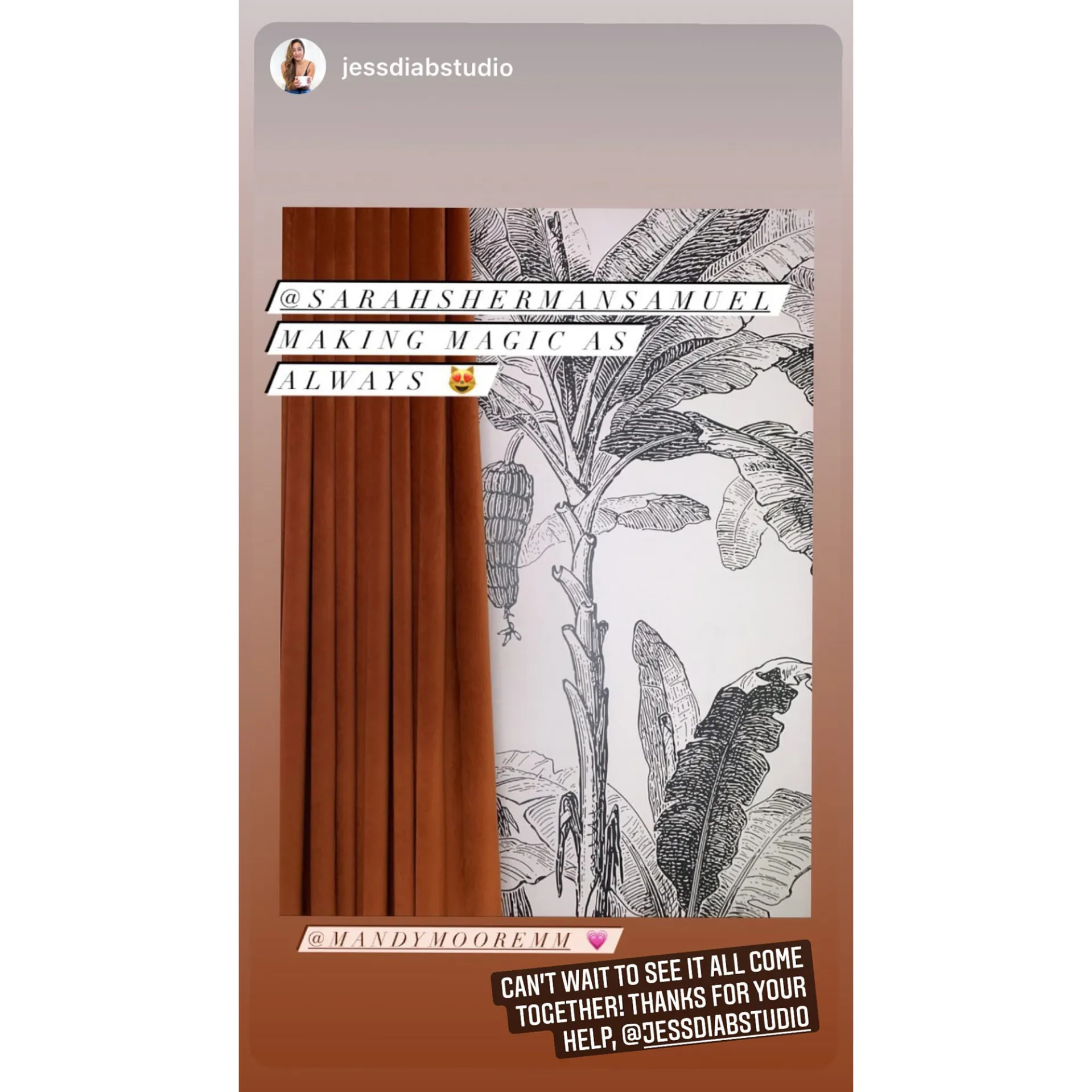 The This Is Us star, 36, shared a series of photos via her Instagram Story on Friday, February 5. “@SarahShermanSamuel making magic as always,” one caption of a pic of black-and-white printed wallpaper read.