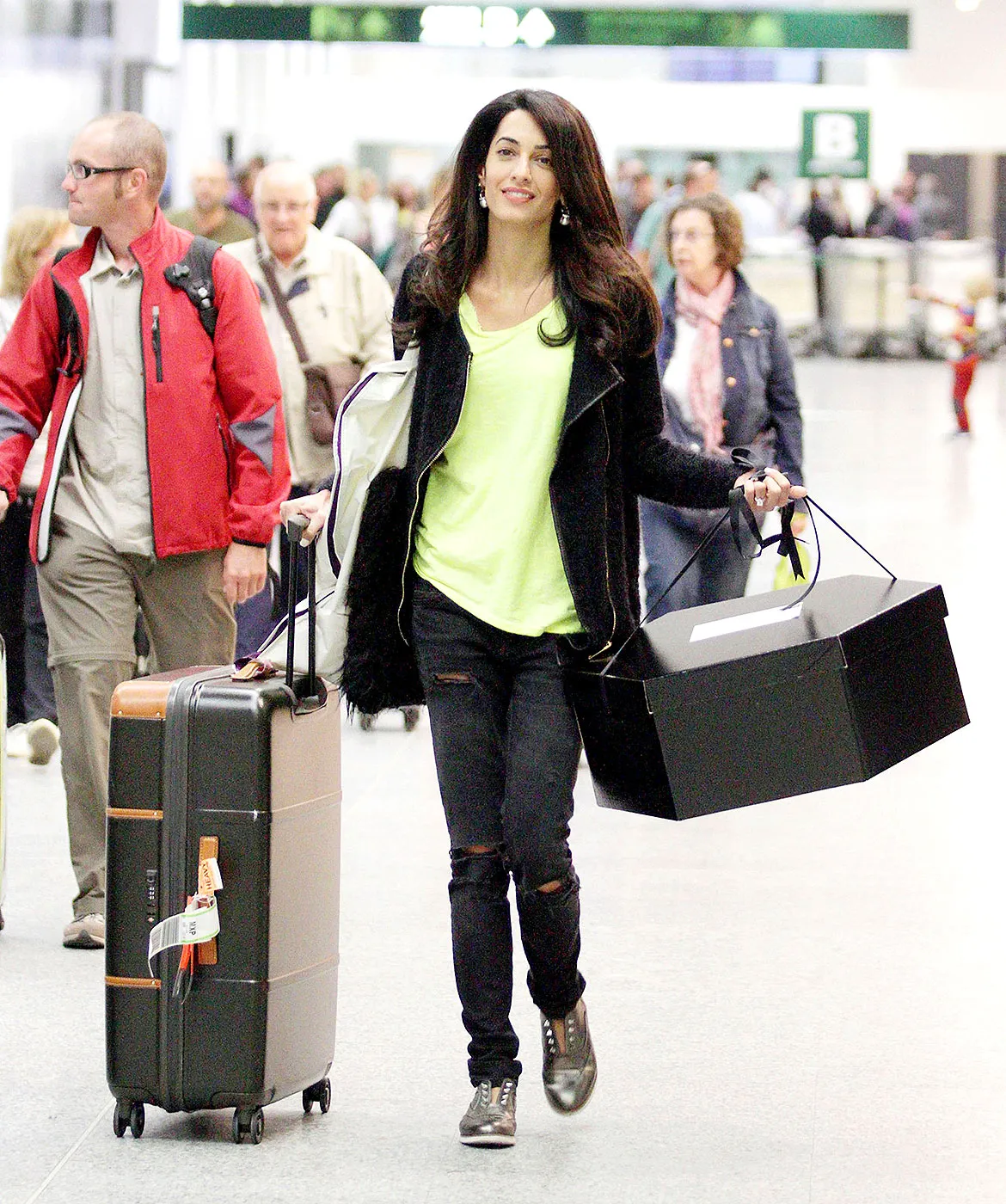 The British Barrister, 36, touched down in a pair of torn jeans, lime green T-shirt, sneakers, and a black jacket. Alamuddin packed light for the momentous occasion, wheeling a suitcase in her right hand as she carried a garment box in the other.