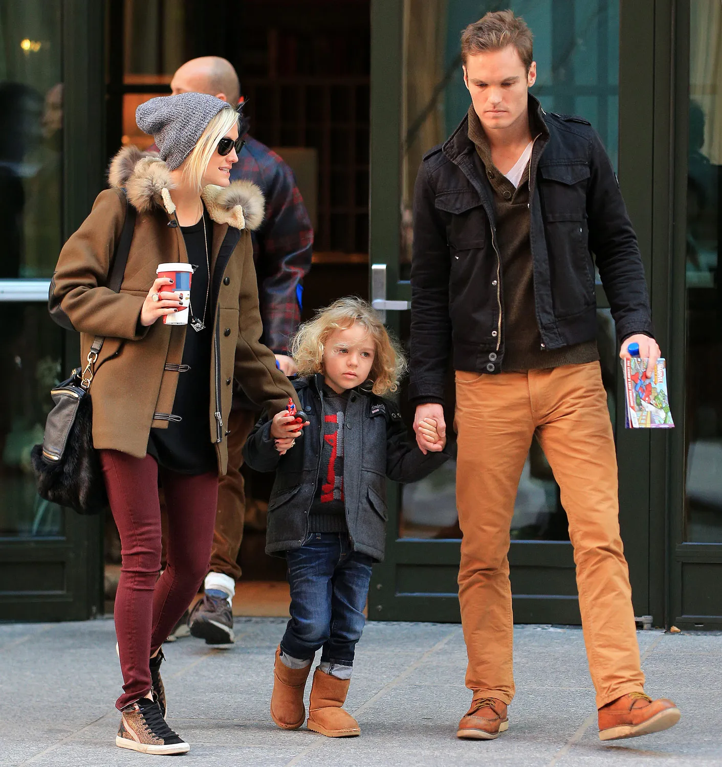 Wearing burgundy jeans, leopard print sneakers, a knit beanie, an Anita Ko rose gold and pave diamond arrow necklace and a fur-lined coat, the single star, 28, sipped a coffee and guided her 4-year-old son Bronx (with ex-husband Pete Wentz) through the Big Apple with the help of a hunky male pal. The blond little boy held hands with both his mom and her handsome, unidentified friend.
